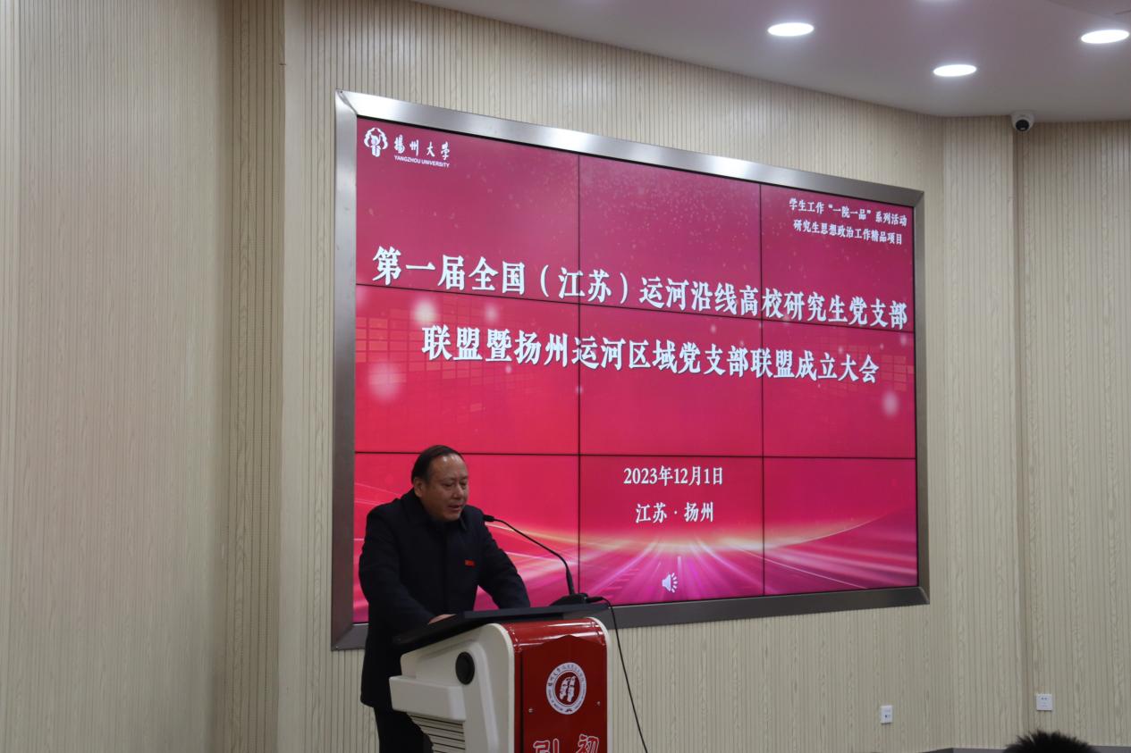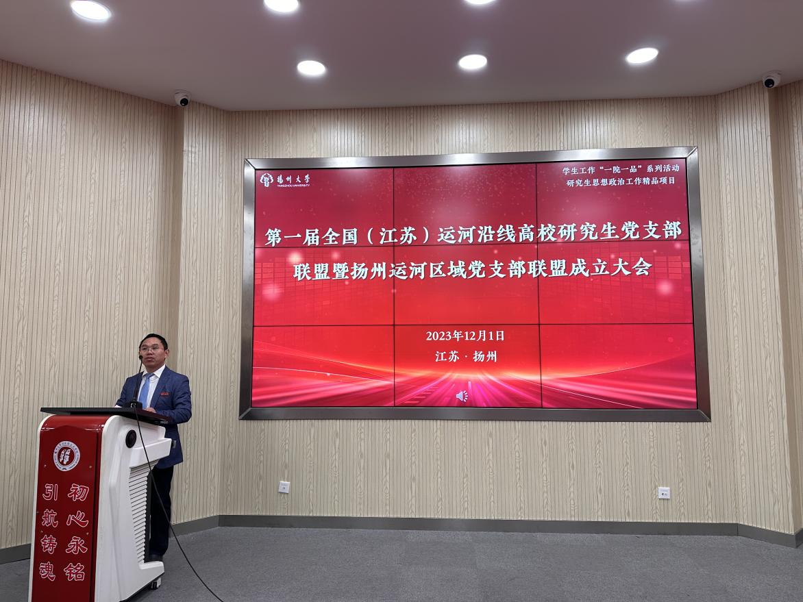 12月1日,第一届全国(江苏)运河沿线高校研究生党支部联盟暨扬州运河区域党支部联盟成立大会在扬州大学水利学院举行。原扬州市委组织部常务副部长、二级巡视员、扬州市党建学会会长徐龙,扬州大学党委常委、组织部部长孙鹏出席大会。来自首都师范大学、浙江工业大学、河海大学等运河沿线8个省、直辖市高校研究生党支部书记,以及扬州运河区域有关单位党支部书记等30多位代表出席会议。