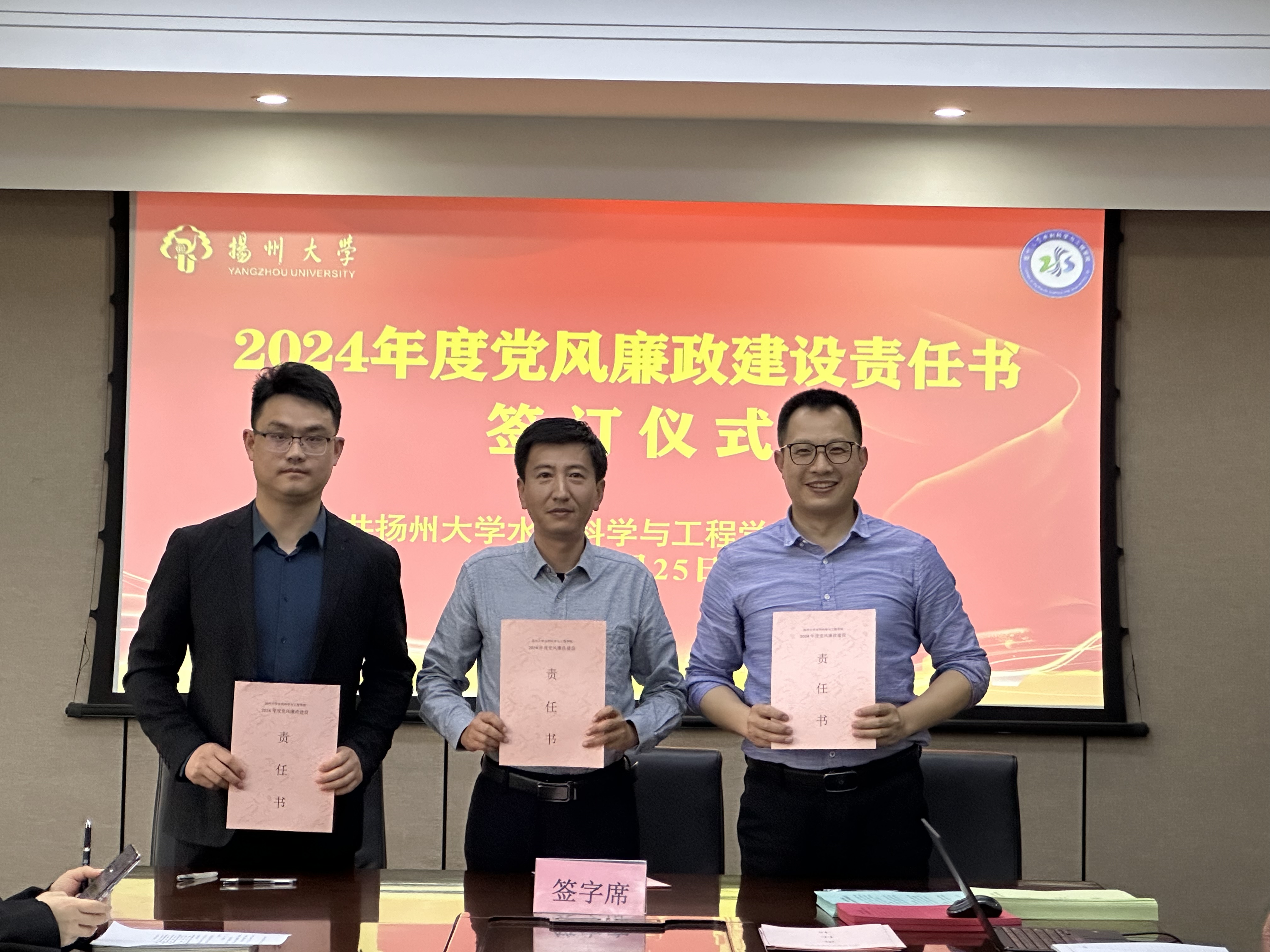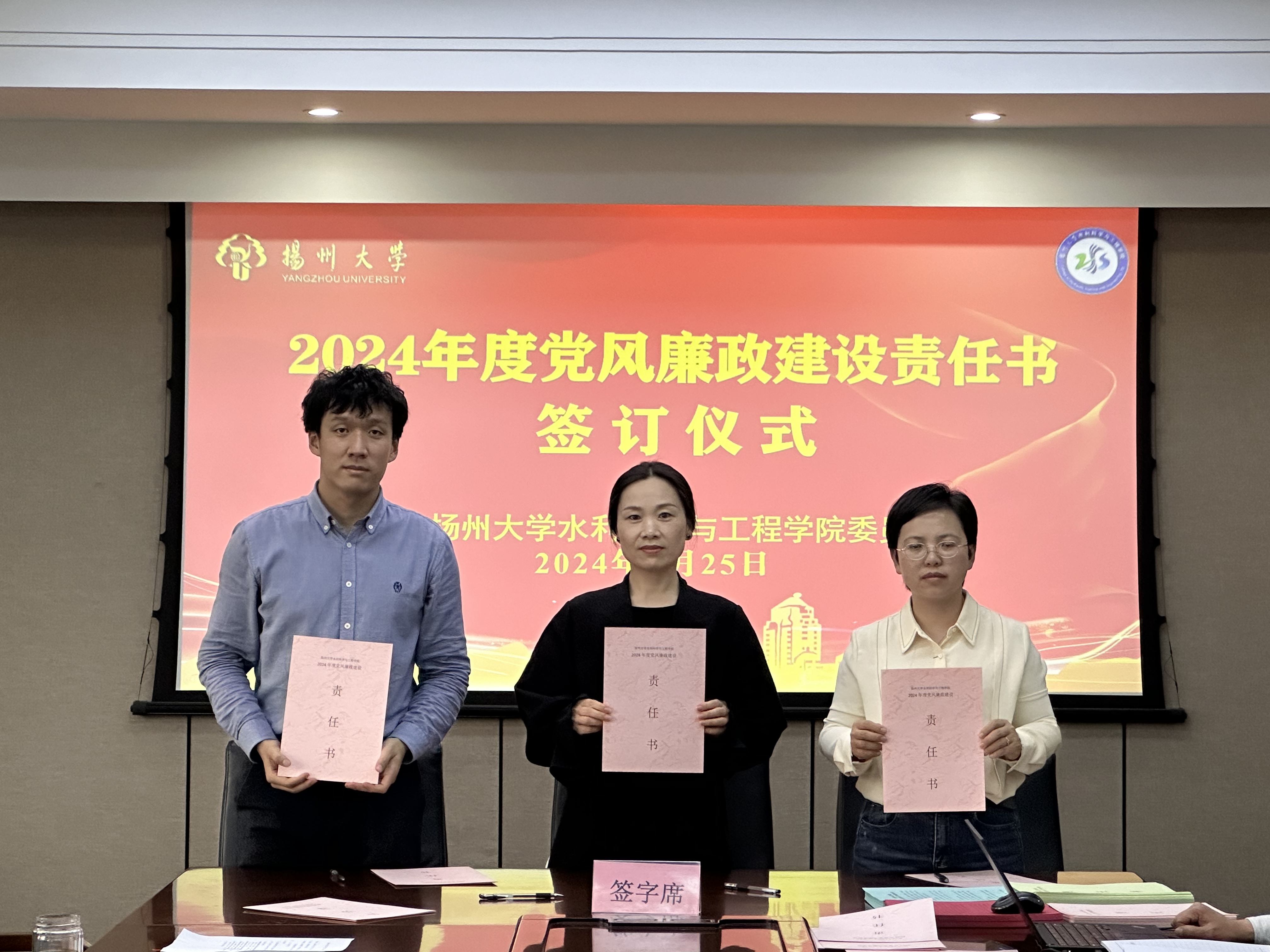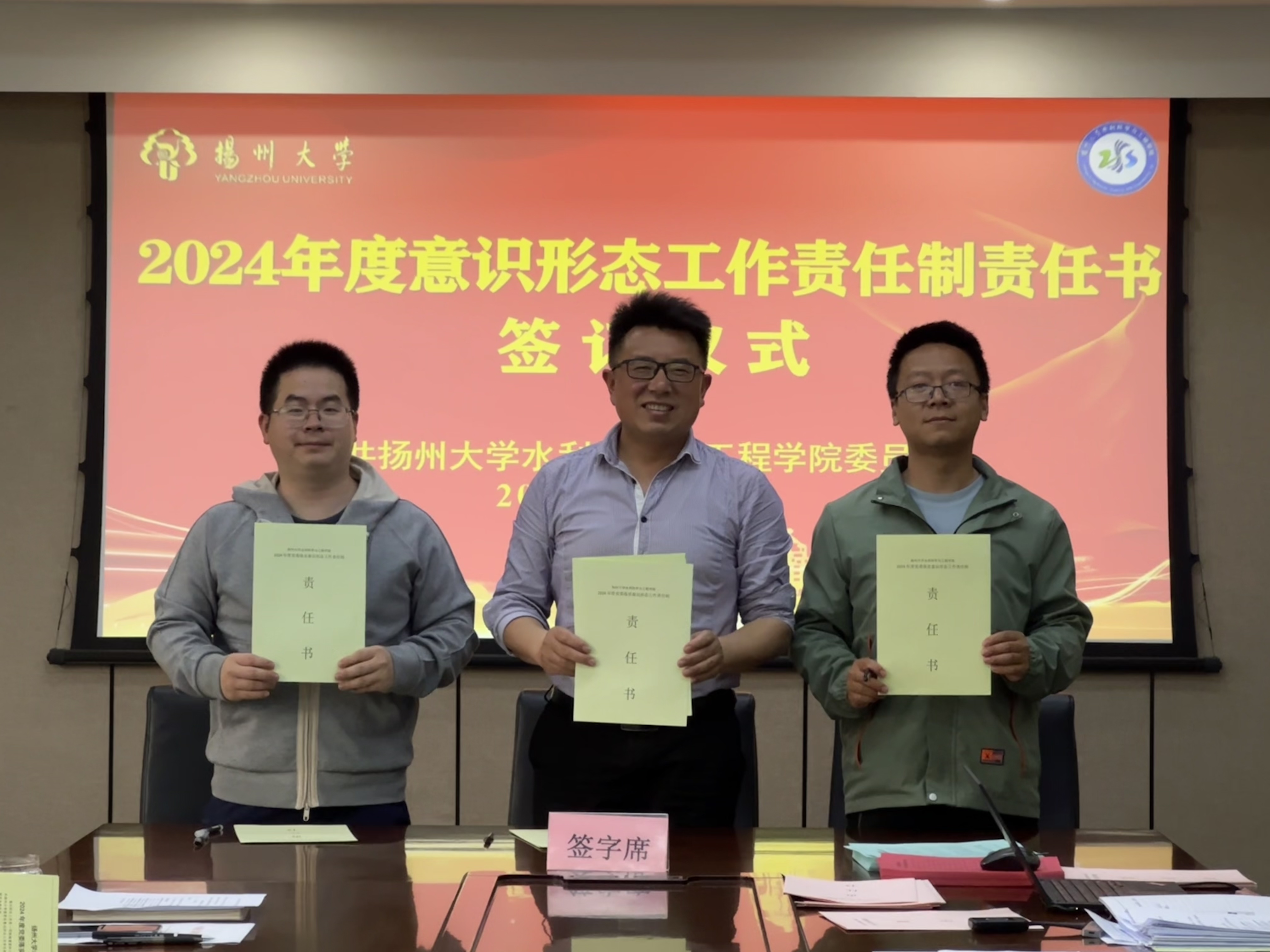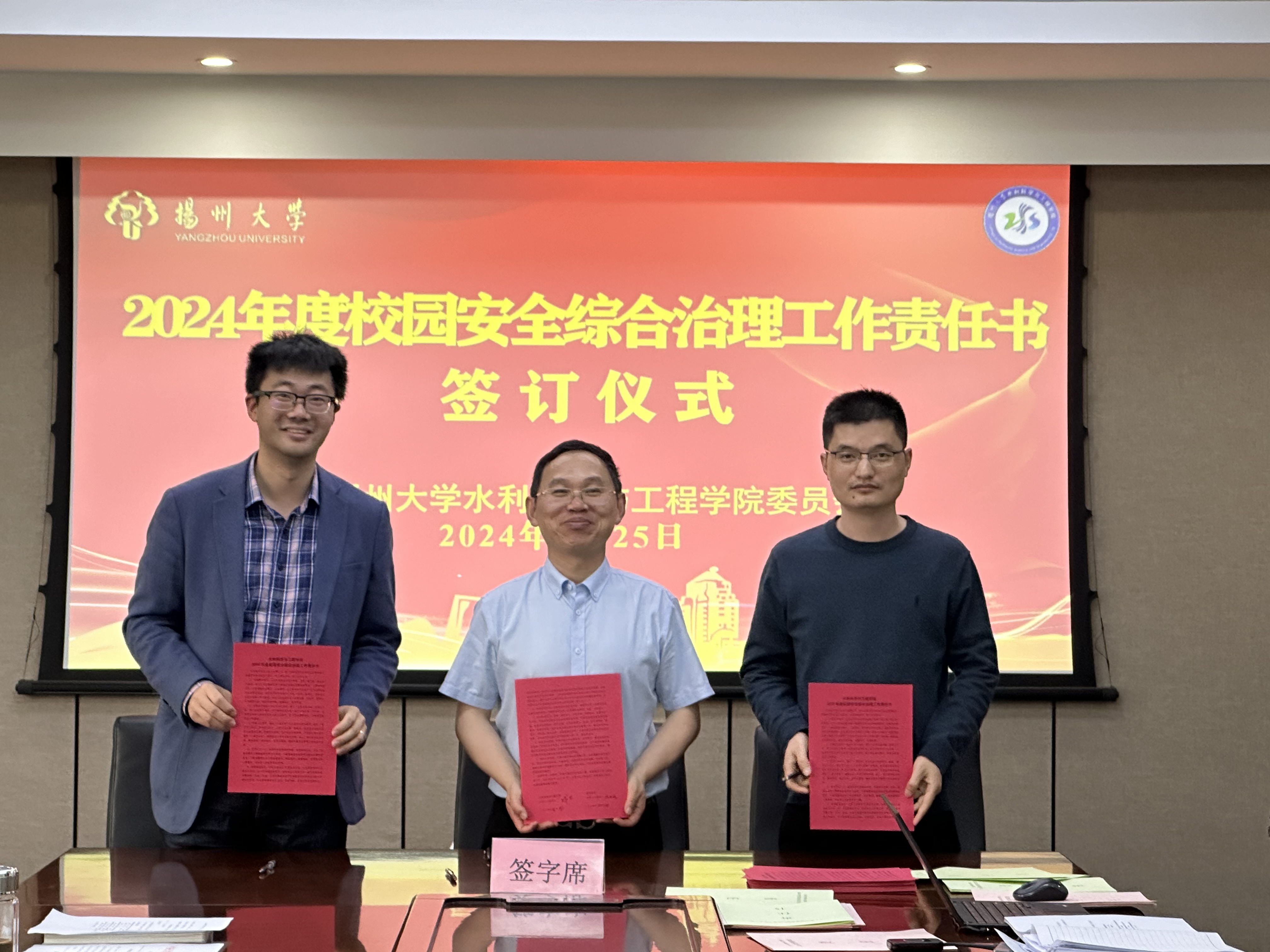 会上,院党委王建军书记带领与会人员重温了学校全面从严治党工作会议精神,学习了《扬州大学2024年校园安全综合治理工作要点》。学院领导分别与责任对象签订了党风廉政建设责任书、落实意识形态工作责任制责任书、校园安全综合治理工作责任书、消防安全工作管理目标责任书。