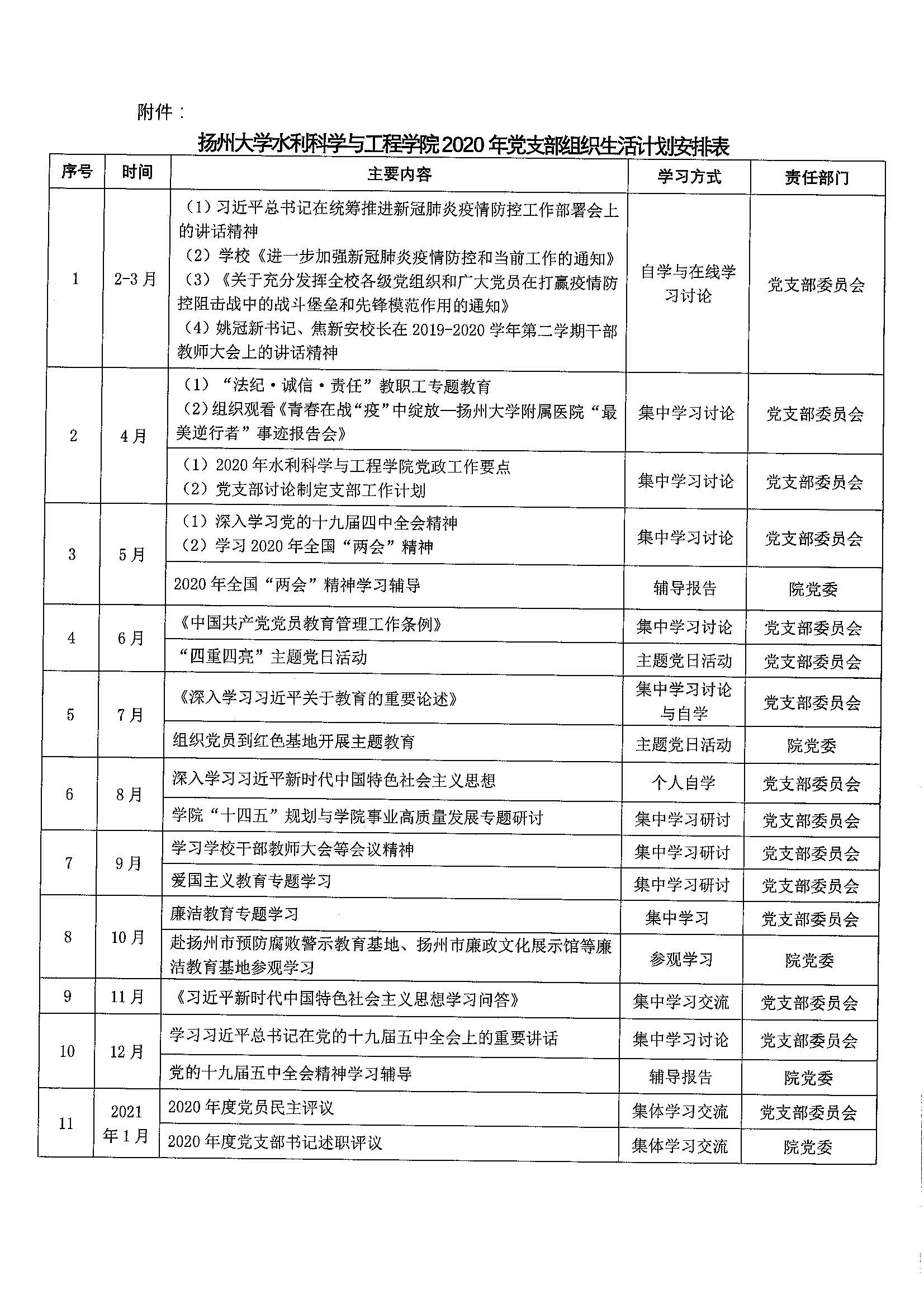 扬州大学水利科学与工程学院2020年党支部组织生活安排表