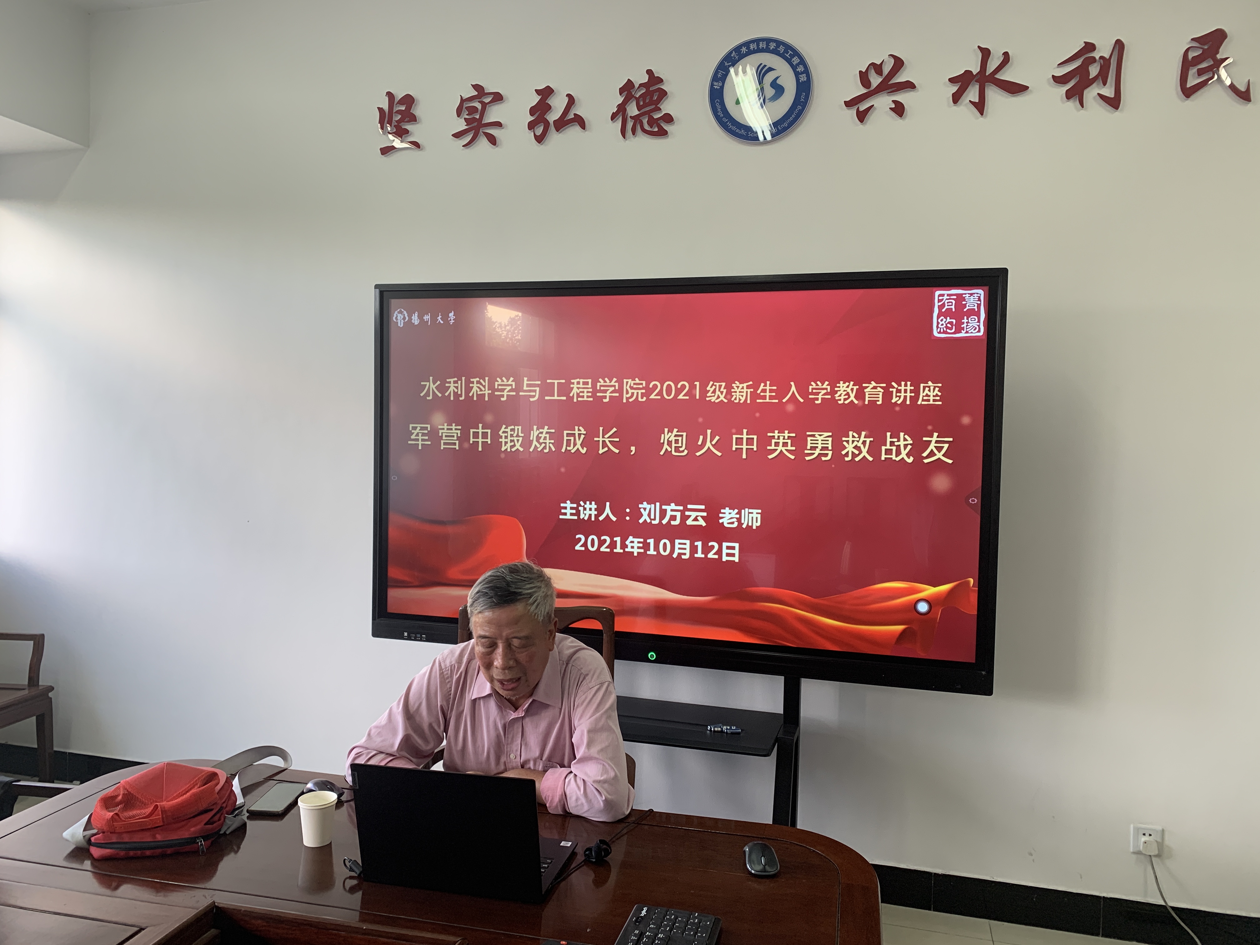 2021年10月12日,我院邀请校关工委刘方云老师为2021级新生作报告。刘爷爷结合自己当年的亲身经历为新生讲述了当年的那段抗战历史。军队大熔炉里成长,炮火中英勇救战友。这短短八个字是刘老师一生的写照。他强调:“贫穷并不可怕,关键是如何面对,有时贫穷也是一种财富”。贫穷磨砺了刘爷爷,让他不断地向着前方向着光明走去。他还指出:“贫穷能让人不忘本,不怕苦,发奋学习。”所以当刘老师捧着他从部队拿到的第一笔津贴6元钱,他决定递给自己的母亲,因为他认为:我们才挣到的第一笔钱要回报亲人回报关爱自己的人。当提到战场上的经历时,他朗声道:“怕死的死得越快,不怕死的才能活着。”这也是中国在武器装备并不先进的条件下能够击败美军的原因:不怕死!