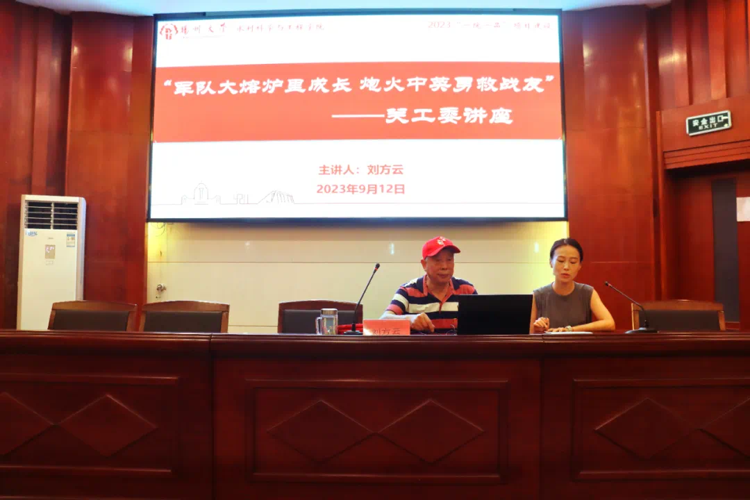 9月12日晚7:00,我院在水利楼报告厅开展2023级新生入学教育,邀请校关工委顾问刘方云老师为全院400余名新生做“军队大熔炉里成长 炮火中英勇救战友”——关工委讲座。讲座由辅导员安文丽主持。