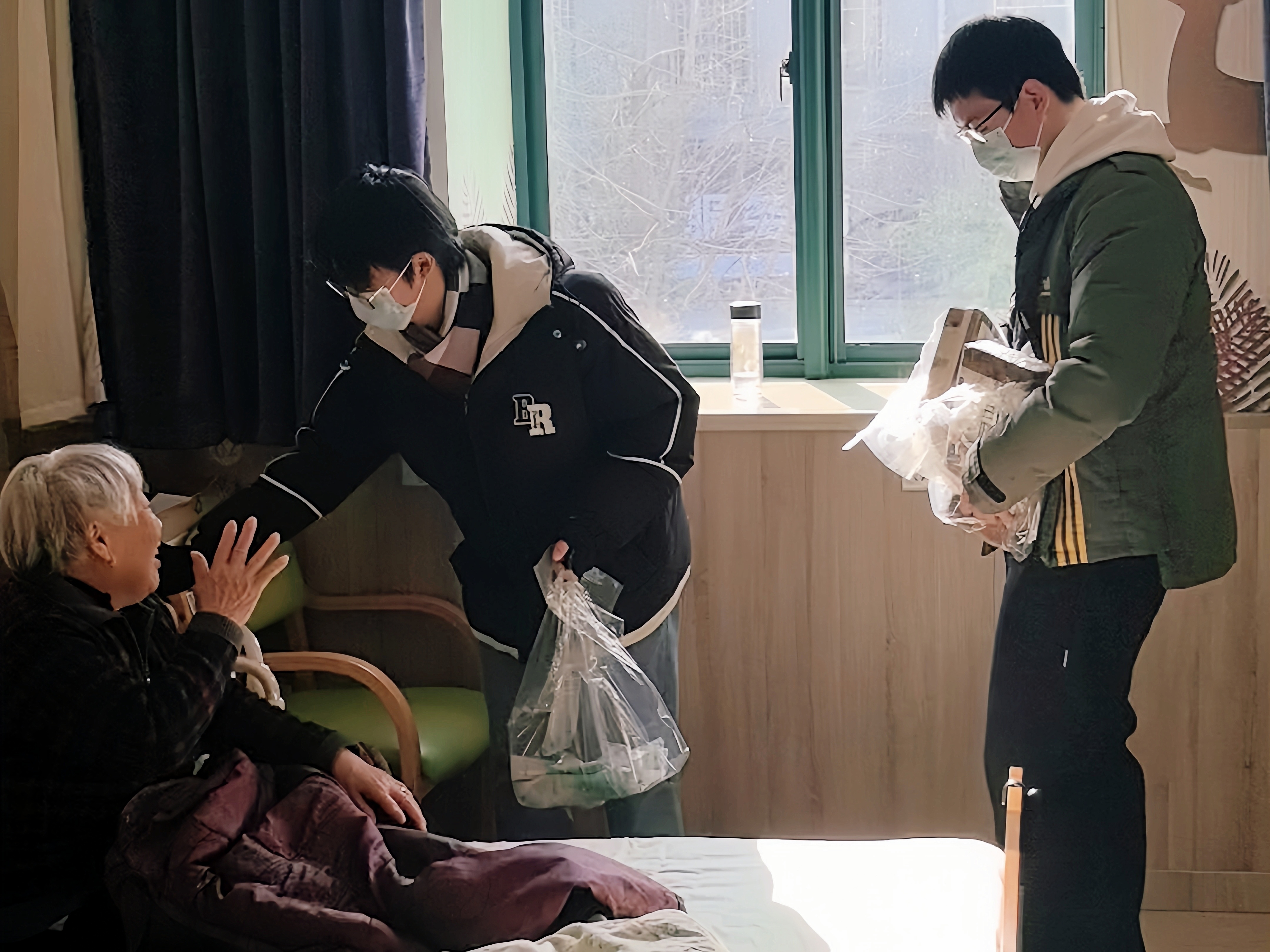 抵达敬老院后,同学们分组行动,将班级精心准备的牙刷、牙膏、纸巾等生活用品送到老人手中。对于行动不便的卧床老人,同学们将物资逐一送到房间内。收到冬至的暖心礼物,老人们的脸上洋溢着欣慰的笑容。一位93岁高龄的卧床老人引起了全体志愿者的关注。据护工介绍,这位老人曾参加过抗美援朝,是一位真正的“最可爱的人”。面对这位革命前辈,同学们充满敬意,与他握手交谈,久久不愿离开,那份感动写在每个人的脸上。