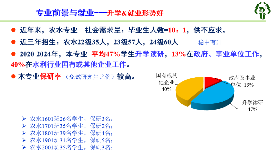近年来,社会对农业水利工程专业毕业生需求持续增加,社会需求量与毕业生人数比例持续保持在10:1以上,长期处于供不应求局面。本专业毕业生考研录取率平均达50%以上,就业质量和层次高,大部分毕业生进入水利、农业等机关事业单位、大中型国有企业、科研院所等单位,成为基层水利单位的骨干力量,受到用人单位的普遍好评和广泛赞誉。