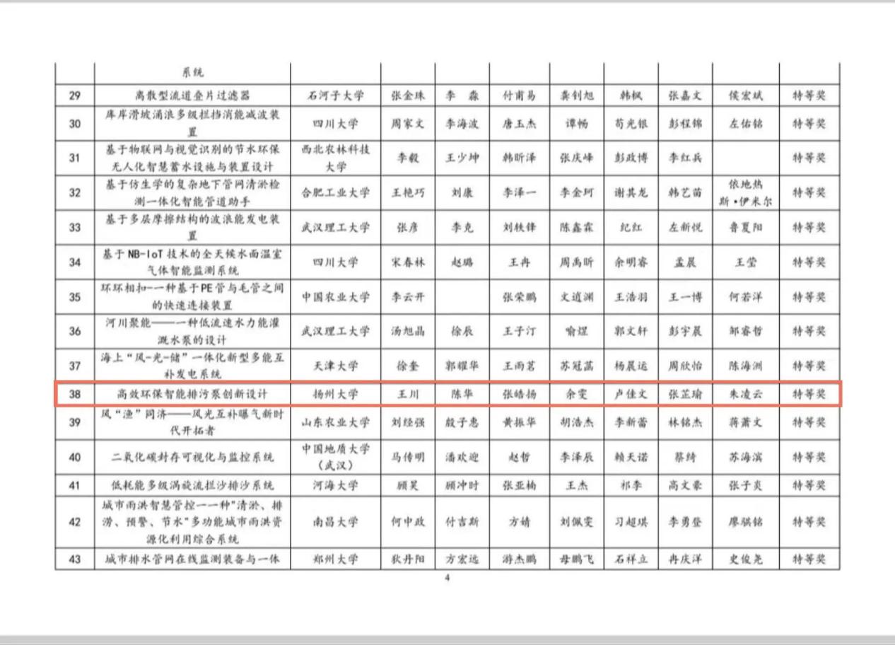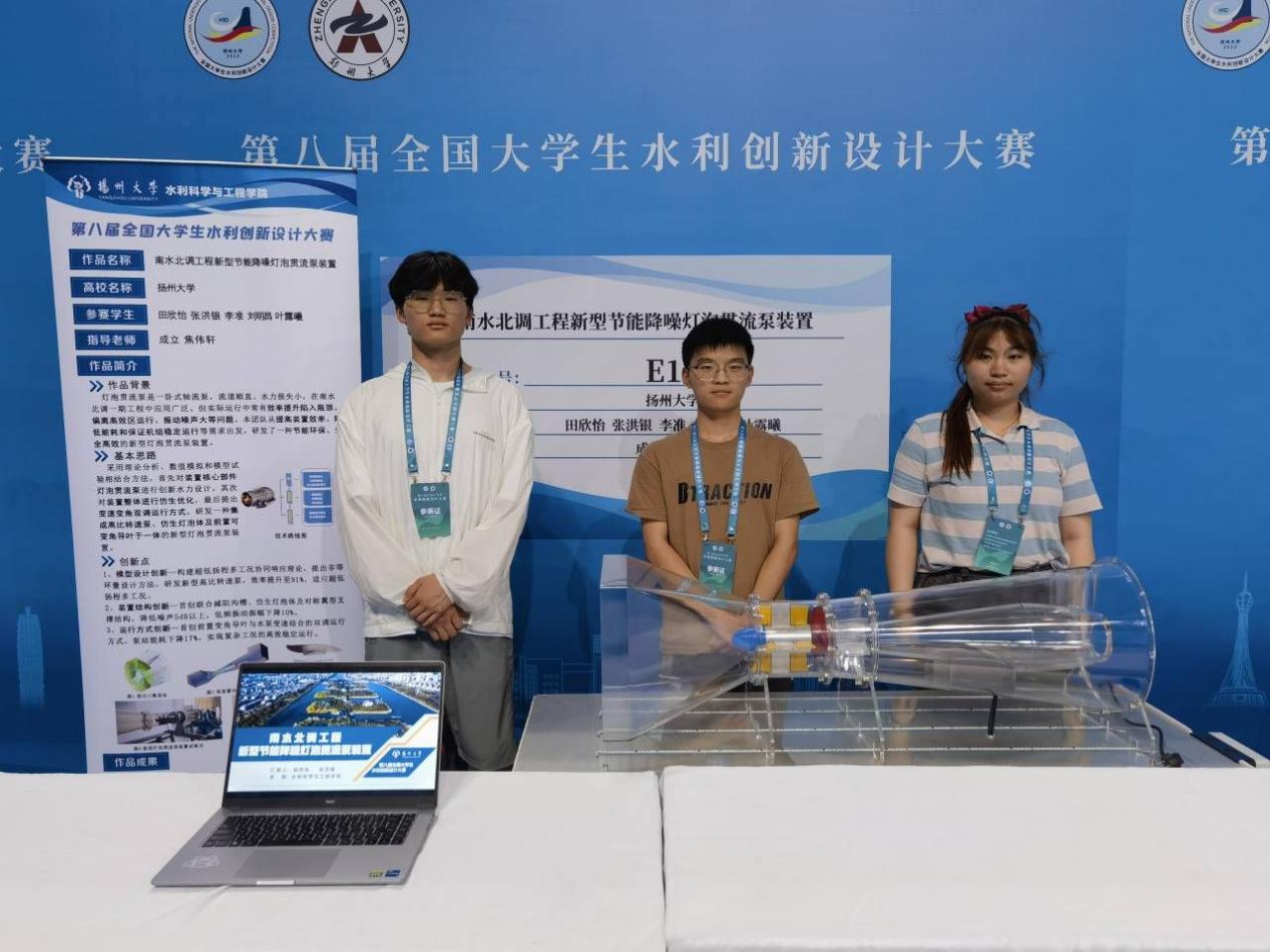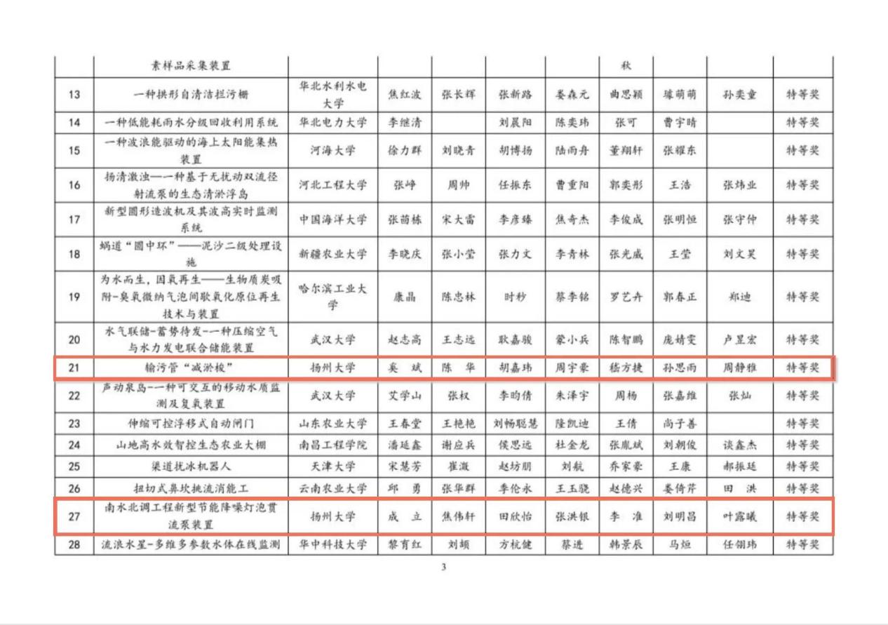 本次大赛包括武汉大学、河海大学、四川大学、郑州大学、天津大学等在内119所高校共计320项项目报名参赛。经过网络评审后,共计156项项目入围决赛。在为期两天的激烈角逐中,经过路演展示和两轮答辩后,扬州大学水利科学与工程学院报送的《输污管“减淤梭”》《南水北调工程新型节能降噪灯泡灌流泵装置》《高效环保只能排污泵创新设计》均获得全国特等奖。