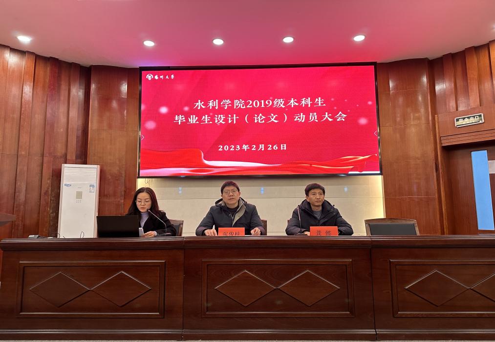 2月26日下午,水利学院召开2019级本科生毕业生设计(论文)动员大会和2023届毕业生就业促进会。院党委副书记张俊桂、副院长龚懿、全体辅导员、毕业班班主任以及2019级本科生参加。大会由年级辅导员陶金沙主持。
