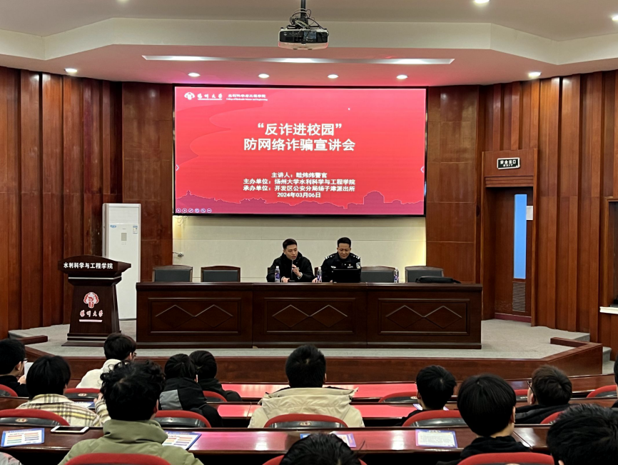 3月6日晚,我院与扬子津派出所在水利楼报告厅联合举办了“反诈进校园”防网络诈骗宣讲会,宣讲会由扬子津派出所所长眭炜炜警官主讲,团委老师王梓承主持,我院200多名学生参加。