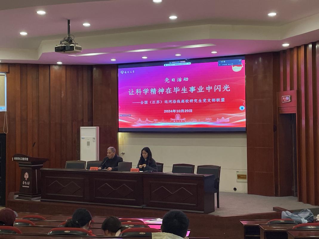 党支部还邀请全国(江苏)运河沿线8个省市20个高校研究生党支部500多人参加党日活动,体现了该支部江苏省党建工作样板党支部的责任和担当。河海大学水利水电学院水力学及河流动力学博士生研究生党支部报告了带领党员科技创新事迹,华北水利水电大学水利学院2023级研究生党支部门如意报告个人科技创新事迹,河北工程大学水利水电学院研究生第一党支部党员温宇婧汇报了学习科学精神的体会,浙江工业大学土木工程学院岩土工程研究所师生联合第一党支部书记何自立教授在活动结束后发来党日活动截屏,称赞“党日活动选了好地方、好主题,很有特色。”