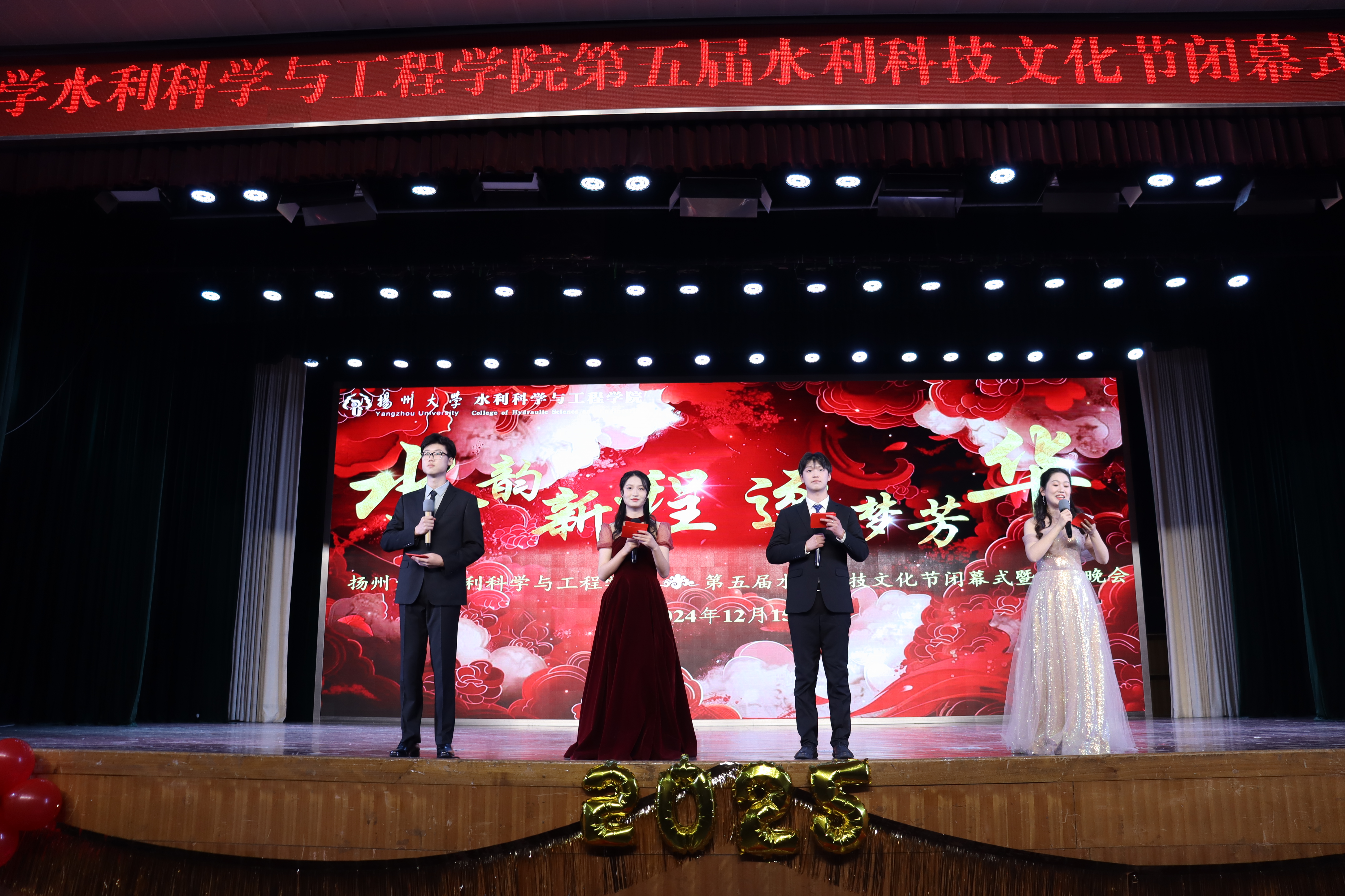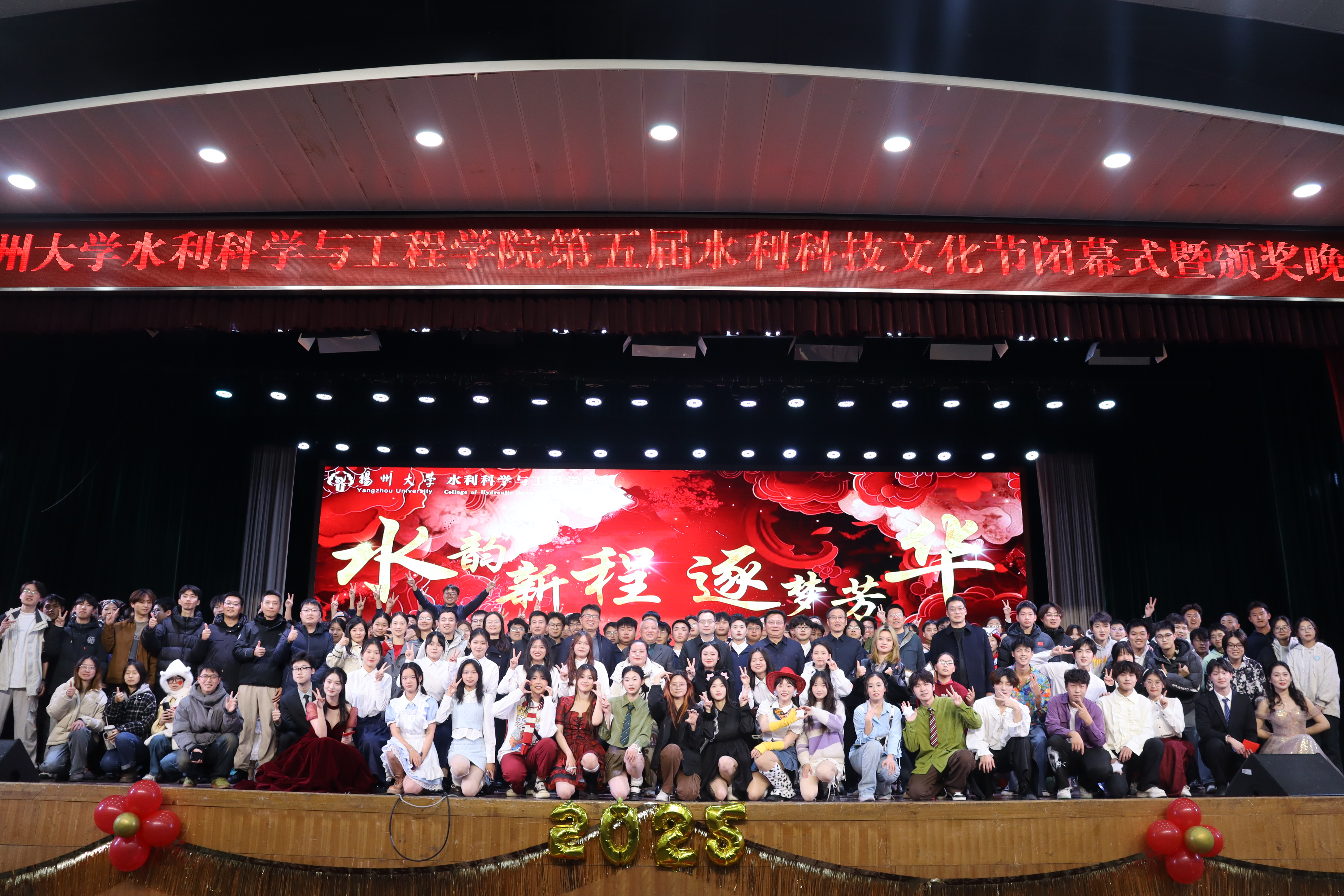 墨染时光,纸卷书香,寒来暑往,又启新章。踏着新年的节拍,2025正一步步的向我们走来,一场专属于扬州大学水利科学与工程学院的璀璨盛宴如期盛放。12月15日晚,第五届“水韵新程 逐梦芳华”水利科技文化节闭幕式暨颁奖晚会在荷花池校区大学生活动中心小剧场隆重举行。校党委学生工作部部长、学生工作处处长施林峰,校党委研究生工作部部长吴刚,校就业指导中心主任陈轶群,关工委办公室主任、副秘书长刘汉柏,校团委副书记王敏,水利科学与工程学院党委书记王建军,院党委副书记张俊桂,副院长龚懿出席活动,学院工会主席、教工党支部书记、系科主任、毕业班班主任等老师参加活动。