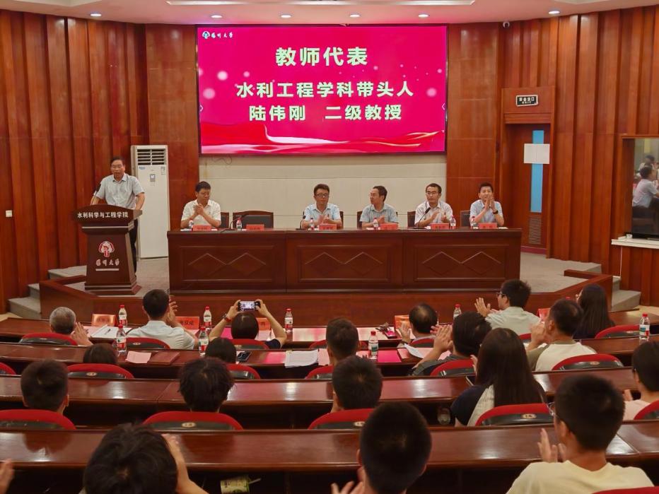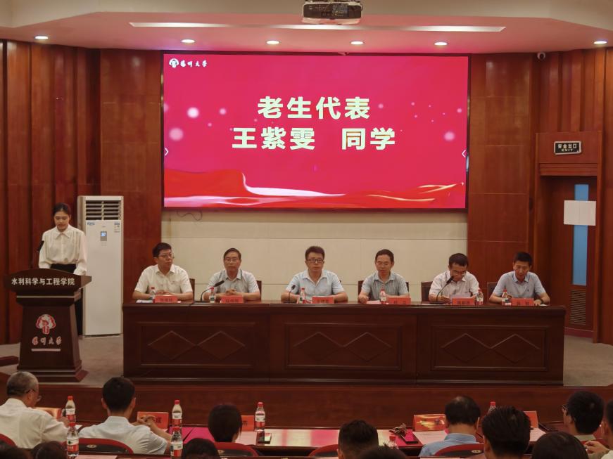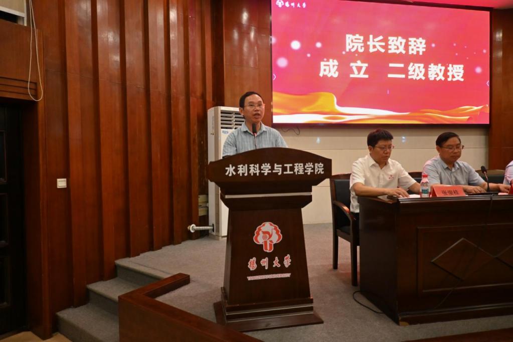成立院长结合当前时代背景与水利学科发展需求,向大家介绍扬州人文底蕴,回顾学院75年发展历程,提及学院的高水平学科平台、优质教师队伍与丰硕科研成果。他向新生提出三点希望:以“上善若水”的品质塑造自我,争做民族复兴的“实践者”与“开拓者”;以“水滴石穿”的精神脚踏实地,在学术道路上行稳致远;以“江河奔涌”的姿态继往开来,打破学科壁垒、博采众长,为水利事业高质量发展贡献力量。