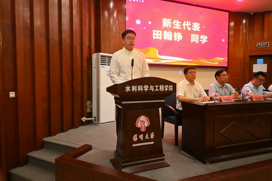 水工2504班的田翰铮同学代表全体25级新生向培育自己的师长与父母表达感谢,同时呼吁大家要做“眼里有光”的青春追梦者、“手上有活”的学业有成者和“肩上有责”的奋进担当者,以行动见证水漾青春,努力成长为堪当民族复兴重任的新时代水利人才,不负时代与韶华。