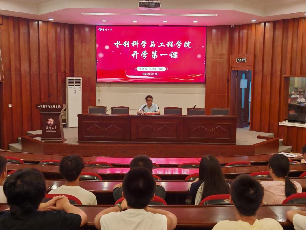 9月7日晚,我院党委书记王建军以“赓续百廿荣光,挺膺时代担当”为主题,在水利楼一楼报告厅为2025级新生讲授“开学第一课”,寄语青年学子以奋斗之力担时代之责。