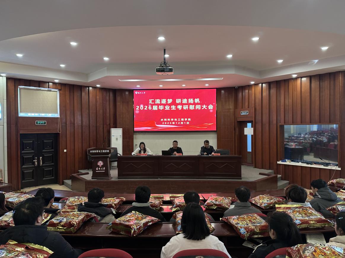 12月1日下午,我院在水利楼一楼报告厅召开26届毕业生考研慰问大会,院党委书记王建军,院党委副书记蒋新跃,院团委书记吴媚,辅导员王梓承、安文丽出席会议,全体2026届考研学子参会。会议由吴媚主持。