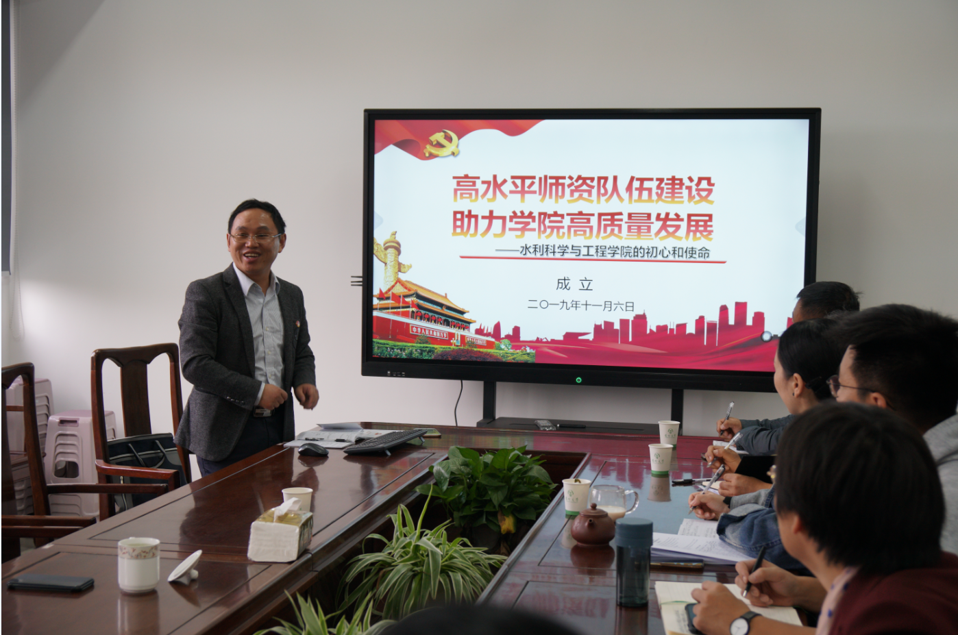 成立结合主题教育专题调研分析了我院师资队伍现状,从“初心之源、政治自觉”、“教师为本,对标找差”、“加强师资队伍建设,助力高质量发展”三个方面,与大家分享了学习心得体会。成立首先由中国共产党人的初心和使命说开来,延伸至水利学院践行教育的初心和使命的重任、担当。分析了师资队伍中存在的问题和主要困境,提出学院师资队伍建设的系列举措,精准指导,加大对学院现有教师的培养力度;内扶外引,加大高层次人才引进力度;强化考核,建立学院教师考评长效机制;落细落实,做实青年教师导师制工作;主动对接,深化与国外高校高层次人才合作交流,为学院师资队伍建设指明了努力方向。