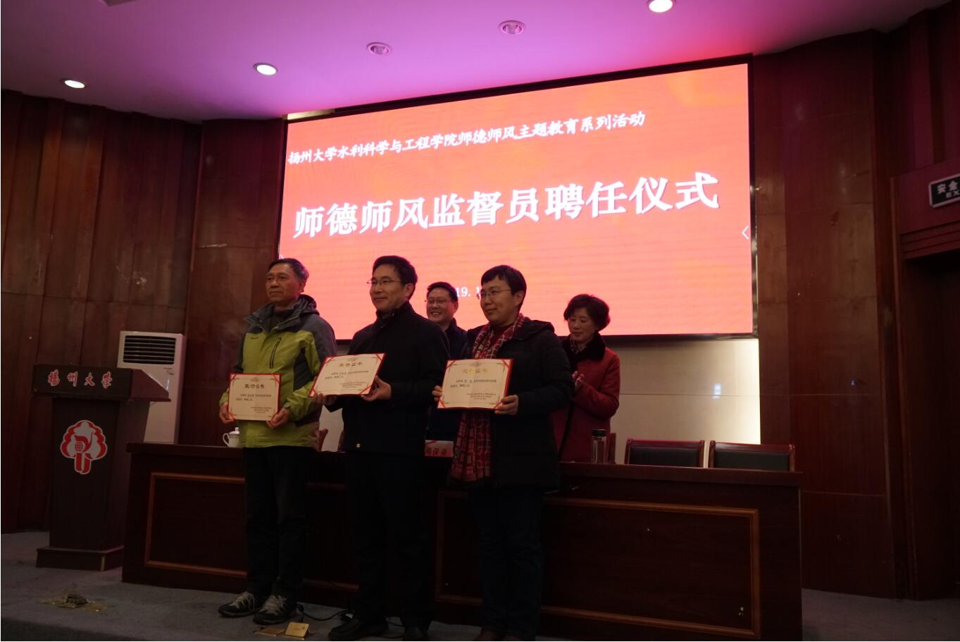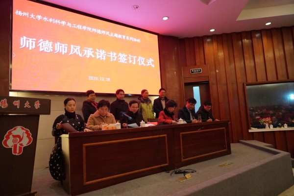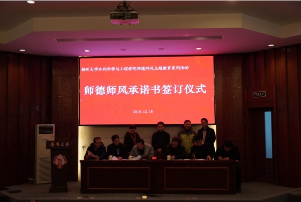 第二项议程,举行了学院师德师风监督员聘任仪式。副院长成立宣读了聘任学院师德师风监督员的决定,聘任吉庆丰、朱红耕、罗纨三位老师为学院师德师风监督员,周保垒部长为其颁发聘书并合影留念。第三项议程,举行师德师风承诺书签订仪式。全体院领导,教师党支部书记、系主任和专业主任等教师代表签订师德师风承诺书;全体教职工签订师德师风承诺书。