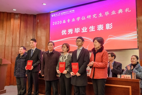毕业典礼在国歌声中拉开序幕。院党委书记杨延红宣读优秀毕业生表彰决定,授予3位校级优秀毕业生和9位院级优秀毕业生荣誉称号,希望全体毕业生再接再厉,发扬“坚实弘德,兴水利民”院训精神,努力成为大德、大智、大气和具有鲜明扬大烙印的一流水利人才。陆处长、杨书记和成院长为优秀毕业生逐一颁发荣誉证书,并合影留念。