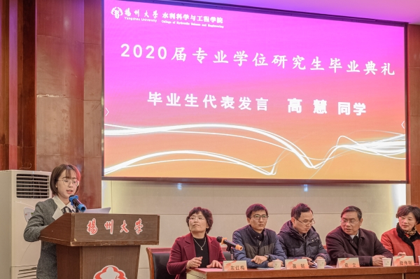 毕业生代表高慧同学回顾了在扬大本硕六年的求学生涯,感言扬大不仅是母校,更像是第二个家,为成长成才铺垫了坚实的路基,感谢扬大的培养和恩师的教导。毕业生代表、水研1701班长张从从同学感悟,扬大“学之以恒,行之以德”的优良学风使我受益终身,不仅学到了知识,也学会了怎样做人,呼吁全体毕业生做到知行合一、学以致用、心系国家、心系扬大,有担当敢作为,在实现中国梦的伟大实践中创造属于自己的精彩人生!
