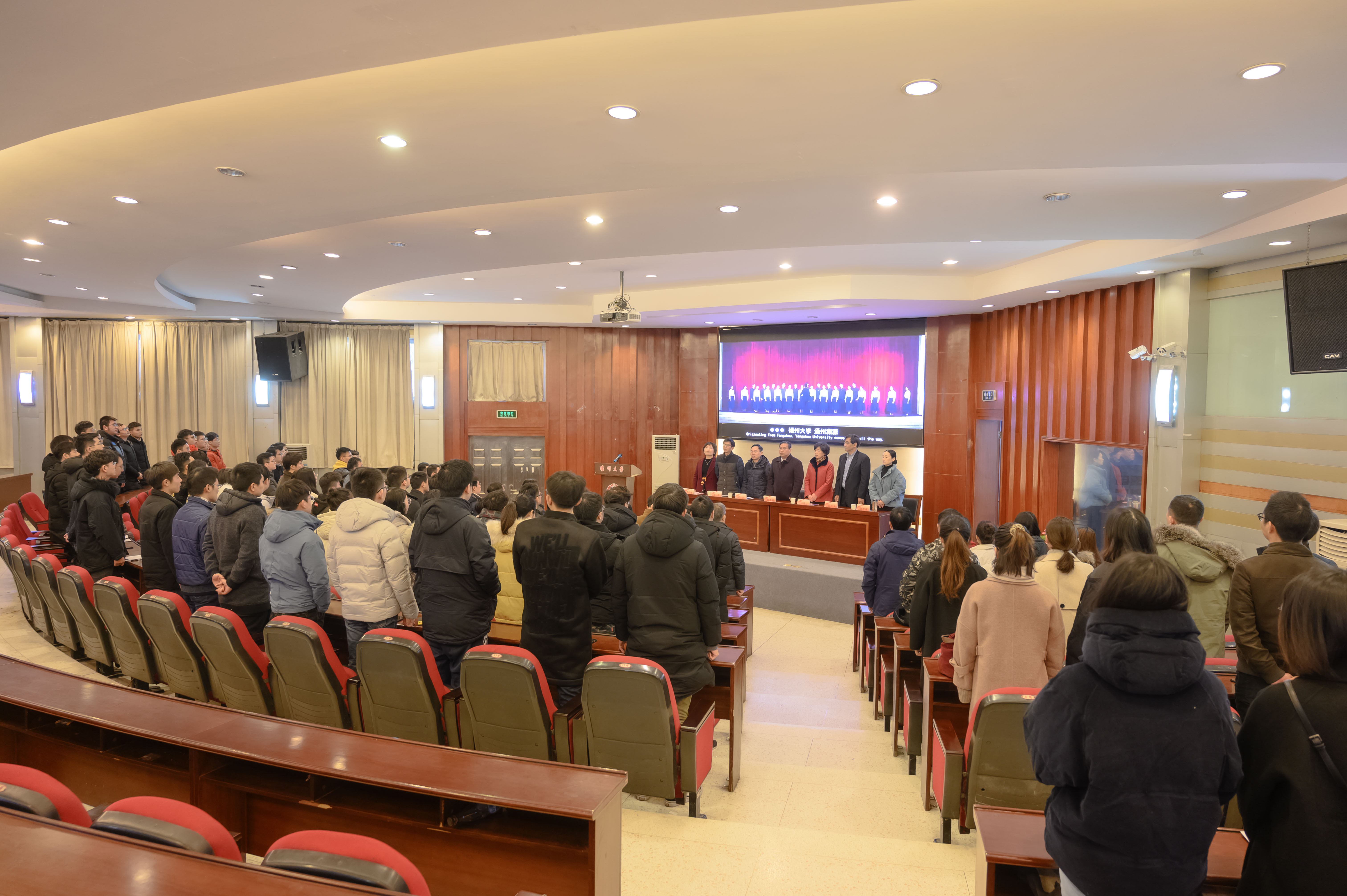 最后,全体与会人员高唱校歌,优美高昂的旋律在报告厅里久久回荡,毕业典礼圆满结束。会后,师生前往工程馆合影留念。