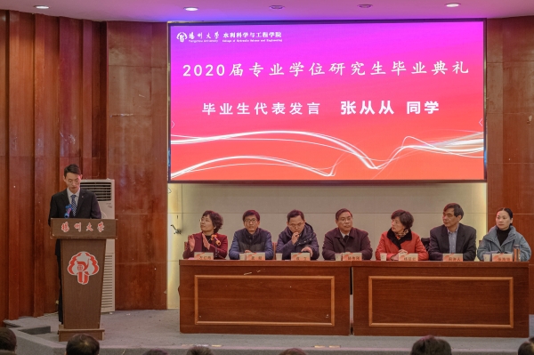 1月2日上午,我院在水利楼报告厅隆重举行2020届专业学位研究生毕业典礼。水利工程学科负责人、校财务处处长陆伟刚、全体院领导、系主任、党支部书记、导师代表、毕业班班主任、院综合办、学工办老师和全体2020届专业学位毕业生、2018级研究生代表齐聚一堂,共同见证毕业生们人生历程中的重要典礼。毕业典礼由院党委副书记左红梅主持。