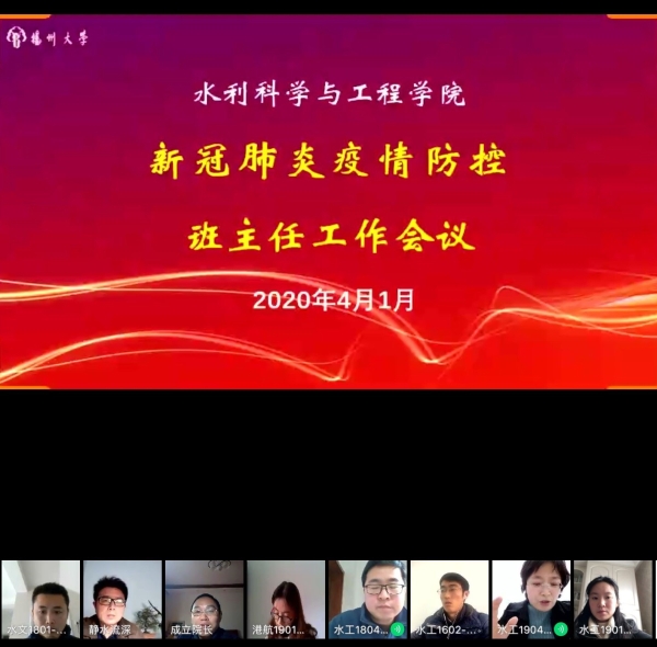 4月1日下午,水利学院召开新冠肺炎疫情防控班主任工作视频会议,对学生疫情防控和开学相关准备工作做了统筹部署和安排。会议由团委书记李新主持,院长成立、党委副书记左红梅和全体辅导员、班主任参加了本次会议。
