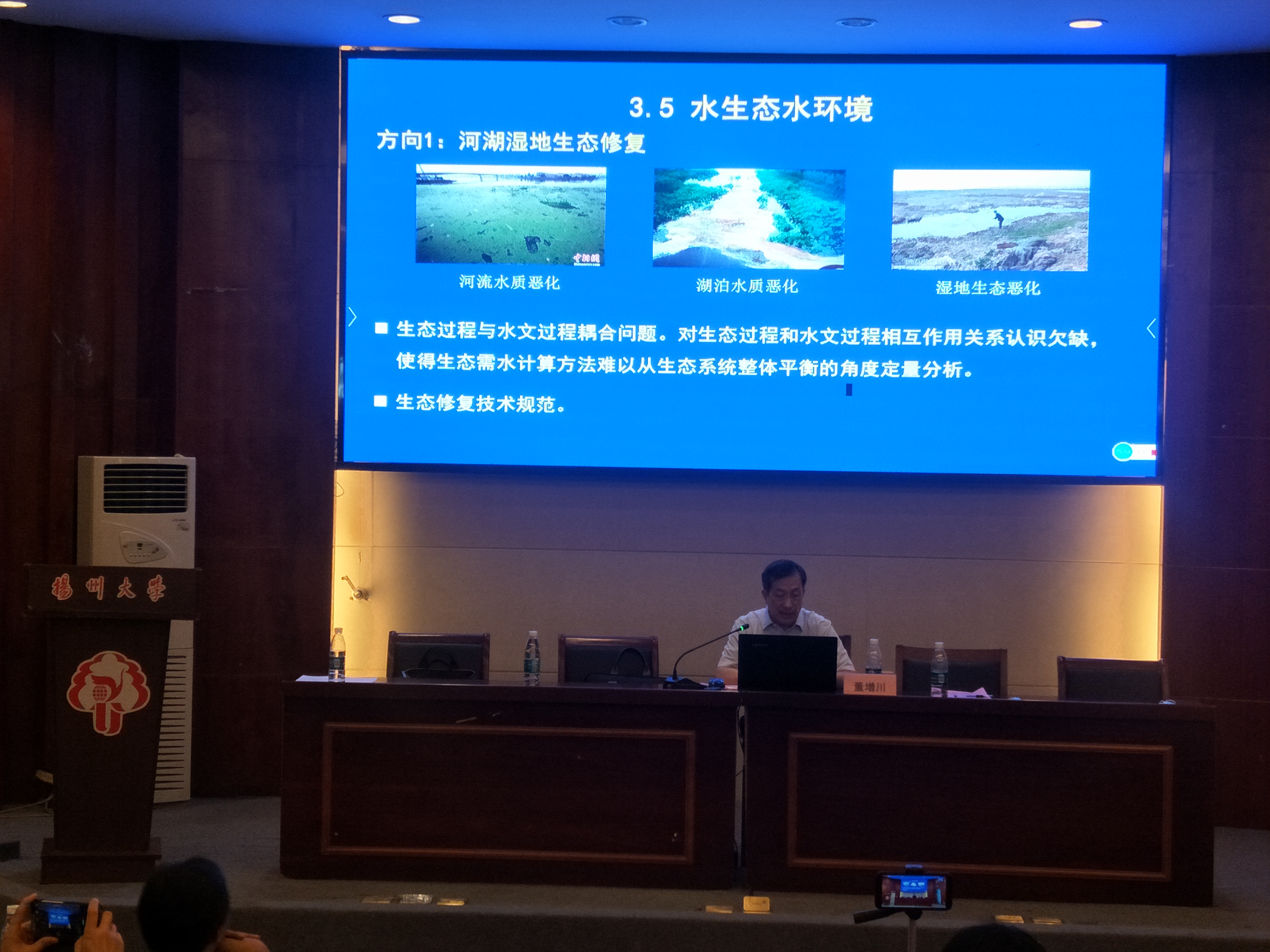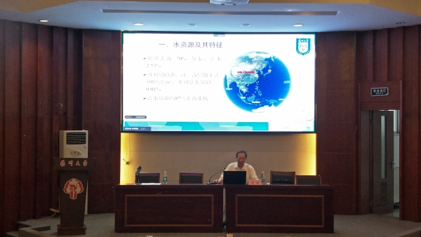 下午3点,江苏省水利动力工程重点实验室主任、扬州大学刘超教授,受邀作《水资源配置与跨流域调水》专题报告。刘教授主要围绕水资源及其特征、水资源的配置方式、跨流域调水工程三大方面进行了报告,并提出了关于跨流域水安全问题的思考。最后强烈呼吁我们,面对工程难题要学会理性分析、独立思考,学好专业知识投身水安全保护事业。