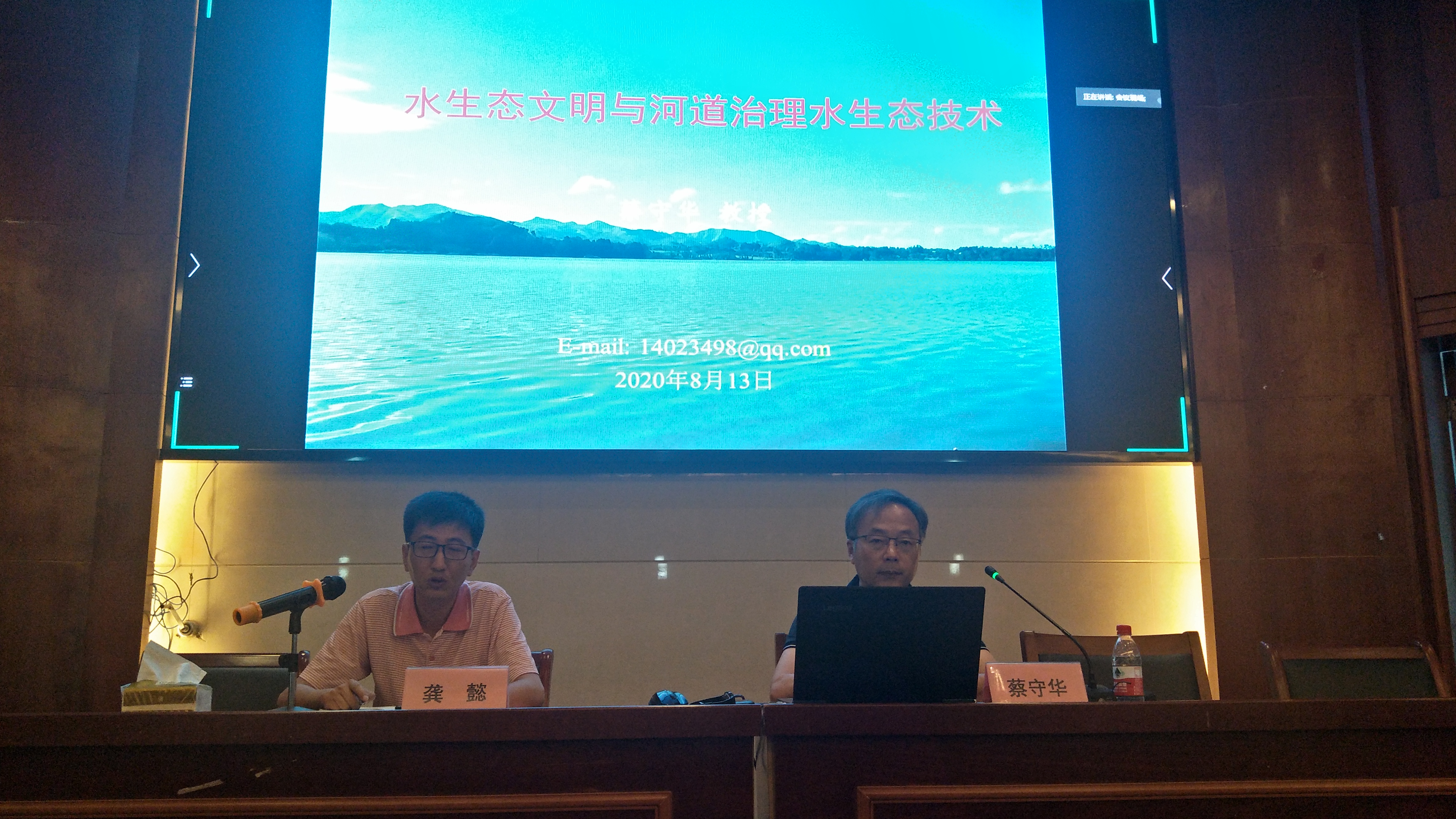 下午4点30分,扬州大学蔡守华教授受邀作关于《水生态文明与河道治理水生态技术》的学术汇报。蔡教授主要围绕经验教训、水生态文明以及河道治理的基本生态技术三个方面进行汇报。蔡教授认为,建设生态工程的关键取决于基本理念:要有尊重自然,保护自然的心态,因此生态工程也其实是“心态工程”。最后呼吁我们要明确人与自然的关系,尊重自然,保护环境,做到与自然和谐共处互利双赢。