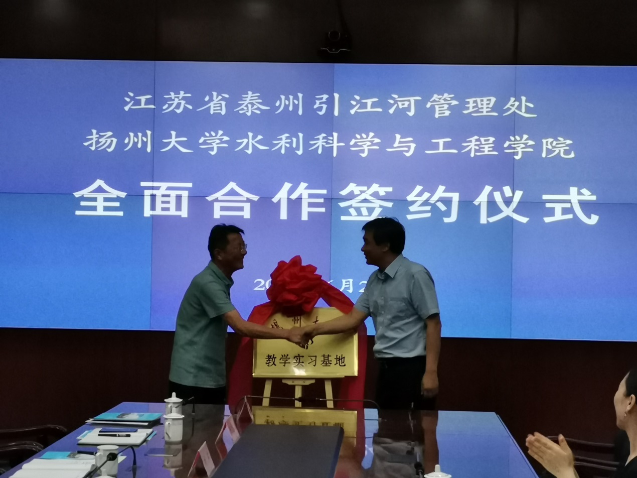 在签约仪式上,成立副院长和姚俊琪主任共同为扬州大学产学研合作基地揭牌,周济人副院长和徐明副主任共同为扬州大学教学实习基地揭牌,张海翎副院长和赵林章副主任分别代表双方单位在全面合作框架协议上签字。在签约仪式前,双方共同观看了省泰州引江河管理处宣传片。签约仪式后,学院领导和省泰州引江河管理处领导进行了座谈,双方分别介绍了各自单位的基本情况,围绕科技合作、人才培养、干部职工继续教育、学生实习和就业等进行了充分的交流沟通,并达成了下一步深入合作的共识。会后,学院领导一行参观了省泰州引江河工程。