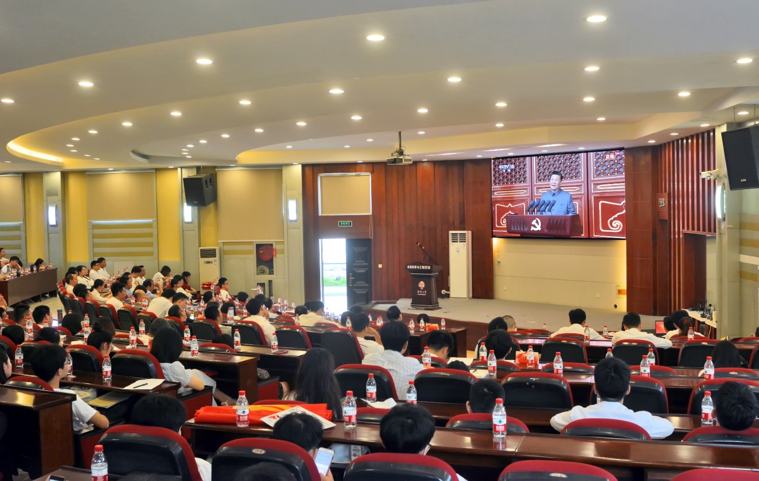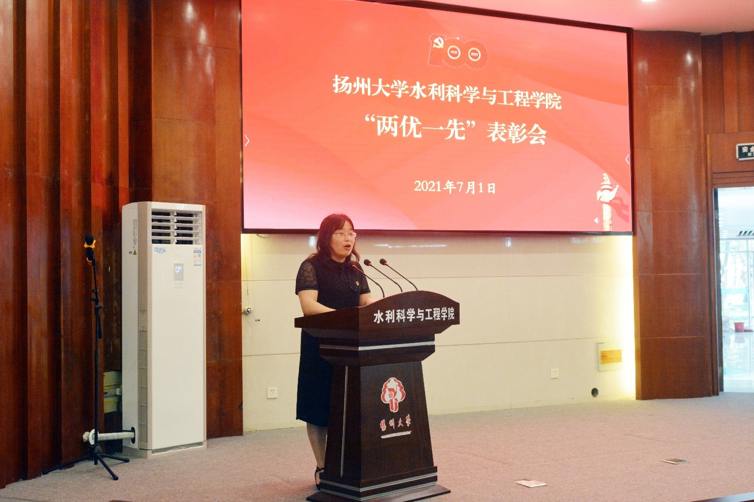 百年征程波澜壮阔,百年初心历久弥坚。今天是中国共产党成立100周年华诞,为激发全院党员干部和师生员工爱党、敬党,为党的事业不懈奋斗的热情和干劲。上午8时,院党委组织全院师生在水利楼报告厅收听收看庆祝中国共产党成立100周年大会直播盛况。在收看庆祝大会结束后,学院举行“两优一先”表彰会。院党委书记杨延红出席活动并讲话,院党委副书记左红梅主持会议,全体在扬院领导、全体教师和学生党员出席活动。