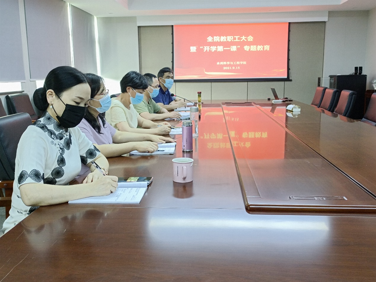 杨延红书记结合传达姚冠新书记在学校2021年秋学期干部教师大会上的讲话精神,以“赓续百年初心,担当育人使命”为题,给全院教职工进行了“开学第一课”专题教育。杨延红首先充分肯定了学院暑期取得的成绩,并对全院教职工在疫情防控中的积极表现以及在学院工作中的担当作为表示感谢。随后,她围绕“信心 使命 担当”对全院教职工提出三点要求:一是增强抗疫信心,继续做好疫情防控,争做抗疫大考中的最美抗疫人;二是明确肩负使命,切实履行育人职责,誓当学生成长中的最美大先生;三是勇于履职担当,奋力推进事业发展,愿为学院发展中的最美建设者。最后,杨延红希望全院教职工保持“乱云飞渡仍从容”的战略定力,聚焦学院十四五事业发展目标,奋力推进年度各项工作目标任务的落地见效,为推动高水平研究型水利学院建设不断作出新的贡献。