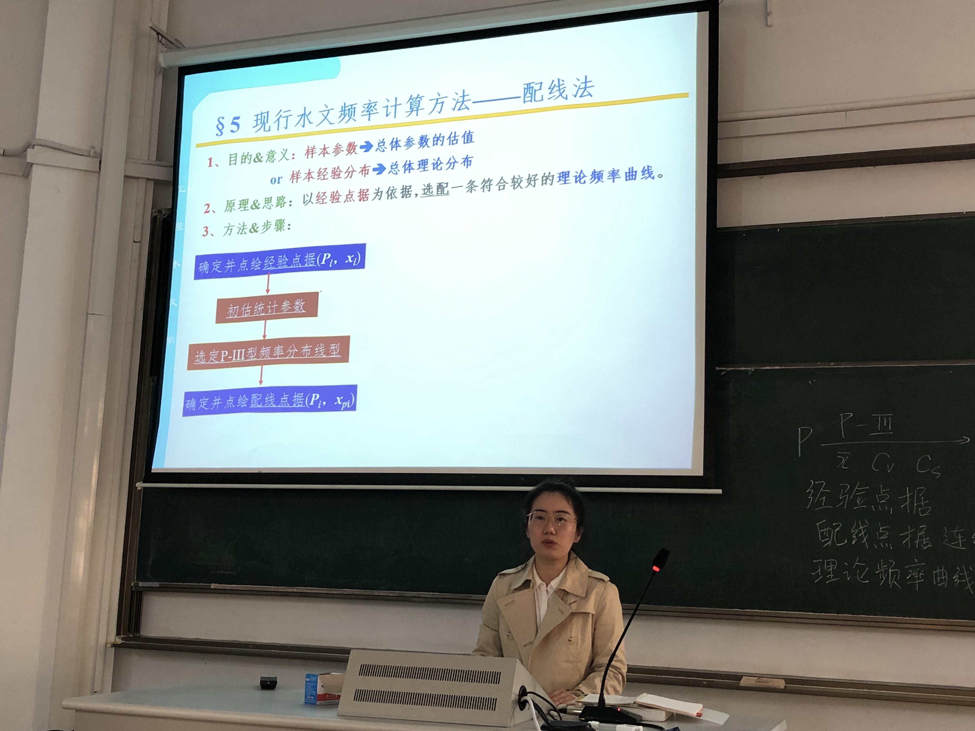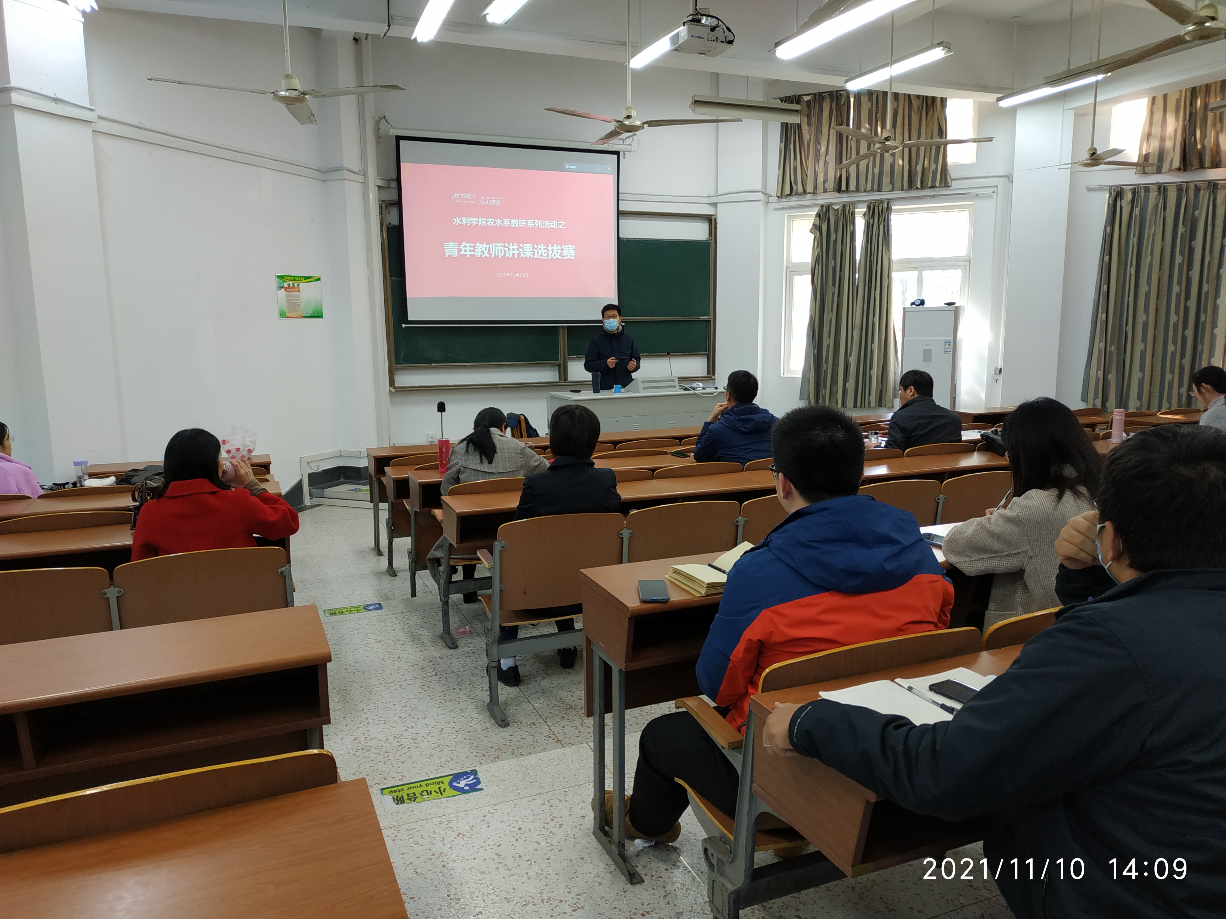 本次选拔赛共分为两个环节,首先是参赛选手自选20分钟的讲课内容,结合PPT、板书等形式进行授课,评委从教学态度、教学内容、教学方法手段和教学效果几个方面进行打分。最后由各位评委老师进行点评,指出了目前存在的问题,为提高讲课水平,并在将来的比赛中取得好成绩提出了很多意见与建议。参赛教师着装典雅大方,精神饱满充沛,教态自然大方;通过图文、软件、动画等多媒体手段教授专业知识,同时注意融入课程思政内容;备课准备充分,知识体系完整,逻辑连贯,信息量大,充分体现了农水系青年教师对待教学严谨、求实、认真的优良传统。