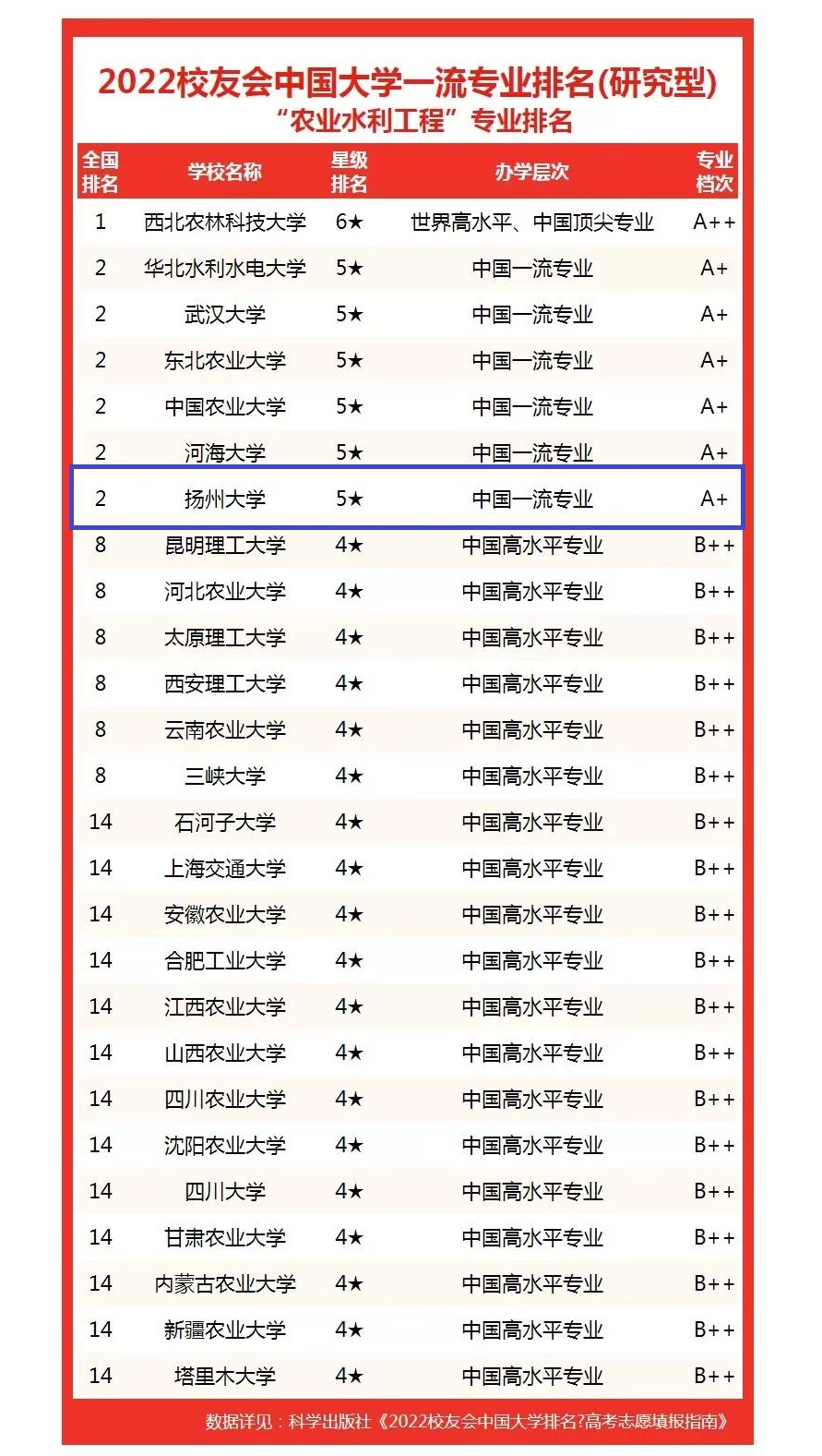 近日,由全国第三方大学评价机构——艾瑞深校友会网(Cuaa.Net)撰写完成、科学出版社出版发行的《2022校友会中国大学排名—高考志愿填报指南》,最新发布校友会2022中国大学一流专业排名。西北农林科技大学、扬州大学等高校位居校友会2022中国大学农业水利工程一流专业排名(研究型)前列。