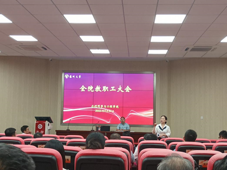 9月20日下午,我院在教学楼引航厅召开全院教职工大会暨2024年度国家自然科学基金申报动员会。会议由院长成立主持,科技处项目科袁锐出席会议并作专题报告,全体院领导、全体教职工参加会议出席会议。会上,成立从国家、单位和个人三个层面深刻阐述了申报及获批国家自然科学基金的重要性,回顾并分析了学院近5年申报基金获批情况,2023年国家科学基金申报立项情况。指出2024年度国家自然科学基金申报工作要进一步加大组织力度,追求精益求精,确保质量提升。