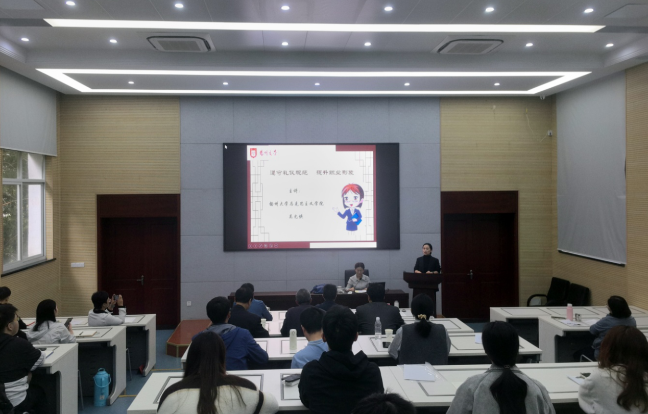 马克思主义学院副教授吴允侠结合丰富的生活实例,生动有趣地介绍了行政礼仪中的内涵及规范。她指导行政人员要“尊重为本、善于表达、形式规范”,并就仪容仪表、服饰礼仪、言谈举止、待客礼仪等方面提出具体要求。