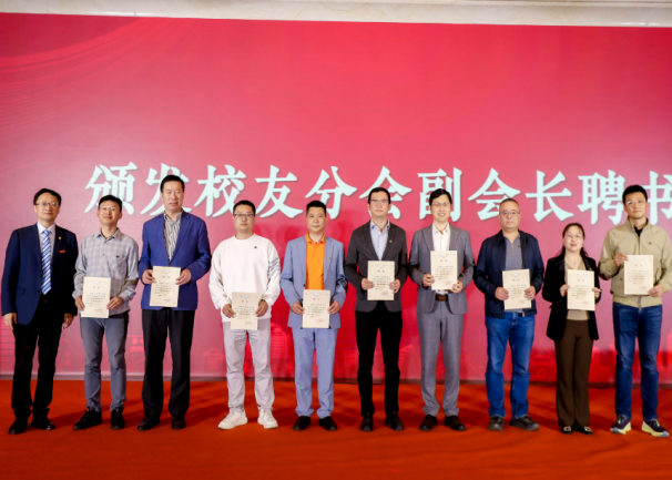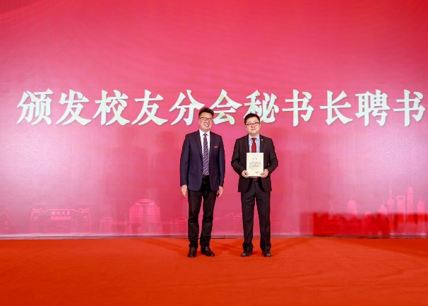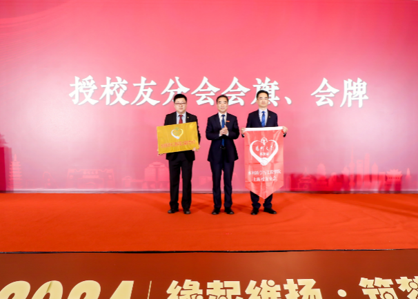 周如军为校友分会授会旗、会牌,与会校、院领导为上海校友分会会长、副会长、秘书长、副秘书长颁发聘书。