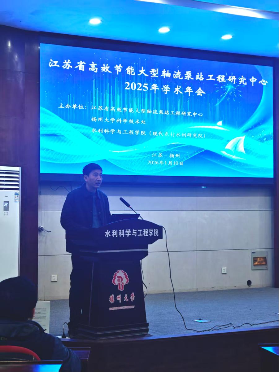 为促进水利工程领域学术交流与技术创新,凝聚行业智慧推动高效节能泵站工程技术发展,近日,江苏省高效节能大型轴流泵站工程研究中心2025年度学术年会在扬州大学江阳路南校区水利楼一楼报告厅顺利召开。本次会议由江苏省高效节能大型轴流泵站工程研究中心牵头,扬州大学科学技术处、水利科学与工程学院(现代农村水利研究院)联合主办,平台全体成员、研究中心开放课题负责人及在读博硕士研究生齐聚一堂,共话学科前沿与实践应用。
