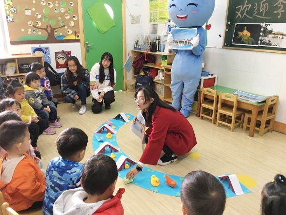 此次活动由水利学院大运河历史与文化宣讲团的大学生担任小老师,为了与小朋友们拉近距离,吸引他们的注意力,水利学院吉祥物玩偶“小水滴”和小老师们一起教小朋友们学唱《数鸭子》,以一首儿歌引出桥、河流、大运河的概念。“小水滴”向大家展示五亭桥、二十四桥、扬州大运河等图片,并带领小朋友们学唱自编儿歌“大运河,长又美,连着南和北……”让小朋友们认识扬州,了解运河。