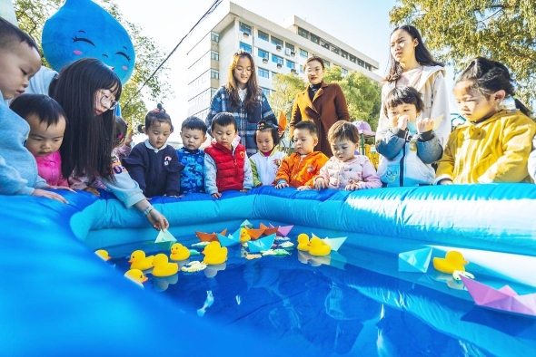 小老师们向小朋友们发放纸船和小黄鸭,引导他们将其安全放置到“大运河”上,再现古扬州运河繁荣景象。