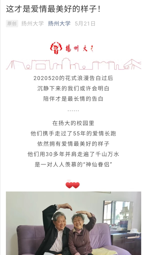 储训教授是我校水利科学与工程学院退休教授、国家机电排灌专业的专家,他与妻子鲁仲云老师的爱情故事在校园里传为佳话。他们自幼相识、青梅竹马,在扬大的校园里种下了爱情的种子,他们已经携手走过的足迹遍布祖国各个角落以及亚洲、非洲、欧洲和美洲的多个国家。这背后是两位老师感人至深的爱情故事。