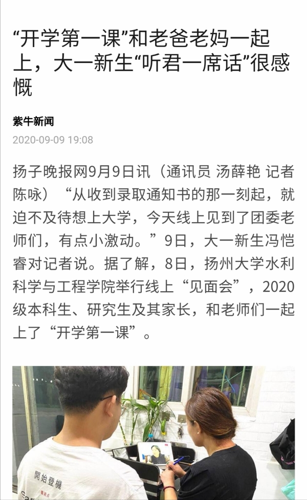 “从收到录取通知书的那一刻起,就迫不及待想上大学,今天线上见到了团委老师们,有点小激动。”9日,大一新生冯恺睿对记者说。据了解,8日,扬州大学水利科学与工程学院举行线上“见面会”,2020级本科生、研究生及其家长,和老师们一起上了“开学第一课”。