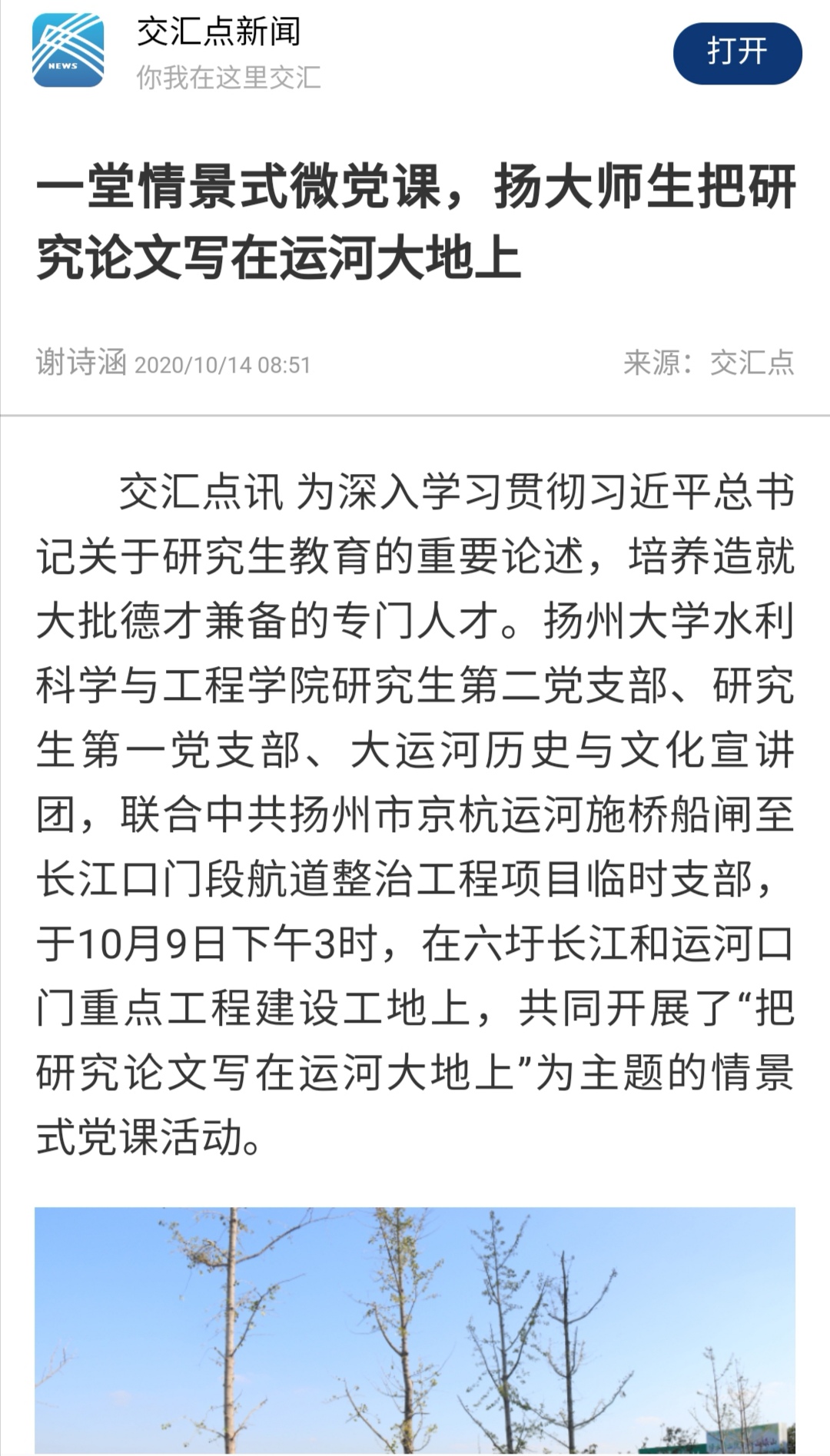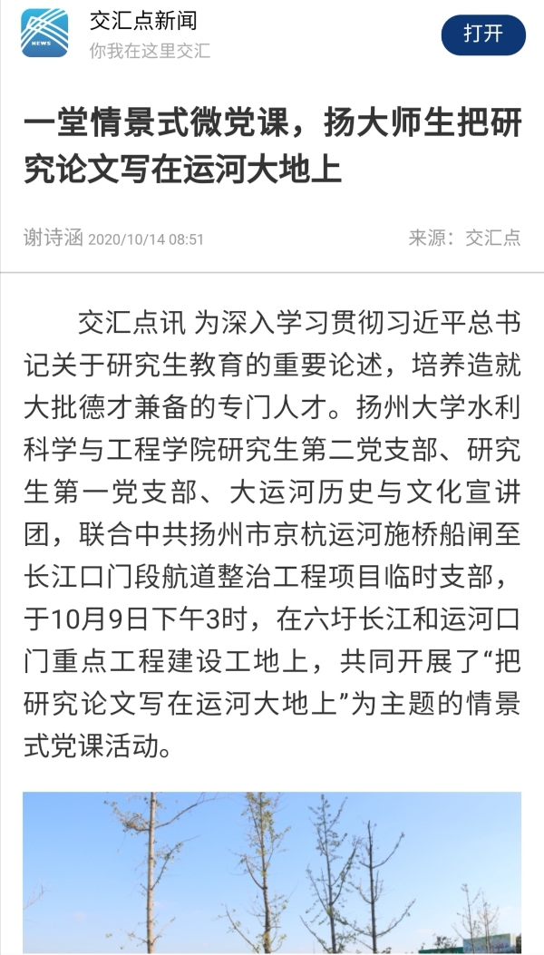 “把研究论文写在运河大地上”情景式党日活动,通过搭建党建交流平台,整合了党建资源,创新和丰富了党课开讲形式,提升了研究生党员教育的针对性和实效性。据悉,扬州大学水利科学与工程学院研究生第二党支部、第一党支部将和中共扬州市京杭运河施桥船闸至长江口门段航道整治工程项目临时支部签署了党建共建协议,共同培养研究生专门人才,服务于重点工程建设。