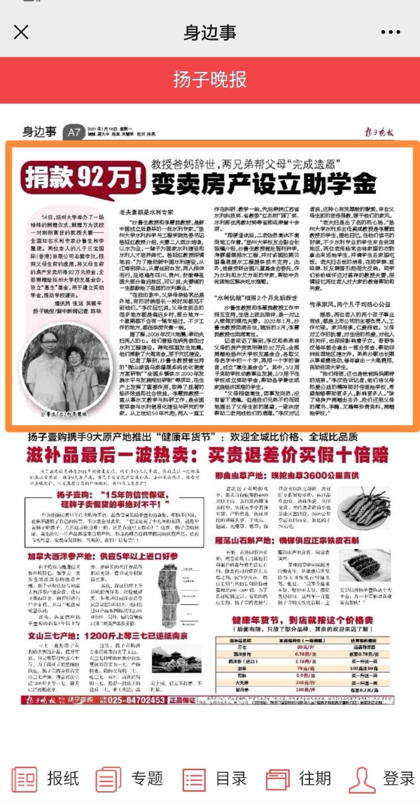 14日,扬州大学举办了一场特殊的捐赠仪式,捐赠方为该校一对刚刚离世的教授夫妻--全国知名水利专家沙鲁生和李慧珑。两位老人的儿子三宝国际(香港)有限公司总裁李汶,按照父母生前的遗愿,将父母生前的房产变卖.所得92万元资金,全部捐赠给扬州大学校友基金会,设立"惠生”基金,用于建立奖助学金,推动学校建设。