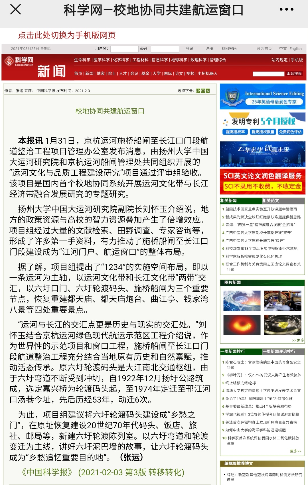 本报讯1月31日,京杭运河施桥船闸至长江口门段航道整治工程项目管理办公室发布消息,由扬州大学中国大运河研究院和京杭运河船闸管理处共同组织开展的“运河文化与品质工程建设研究”项目通过评审组验收。该项目是国内首个校地协同系统开展运河文化带与长江经济带融合发展研究的专题研究。