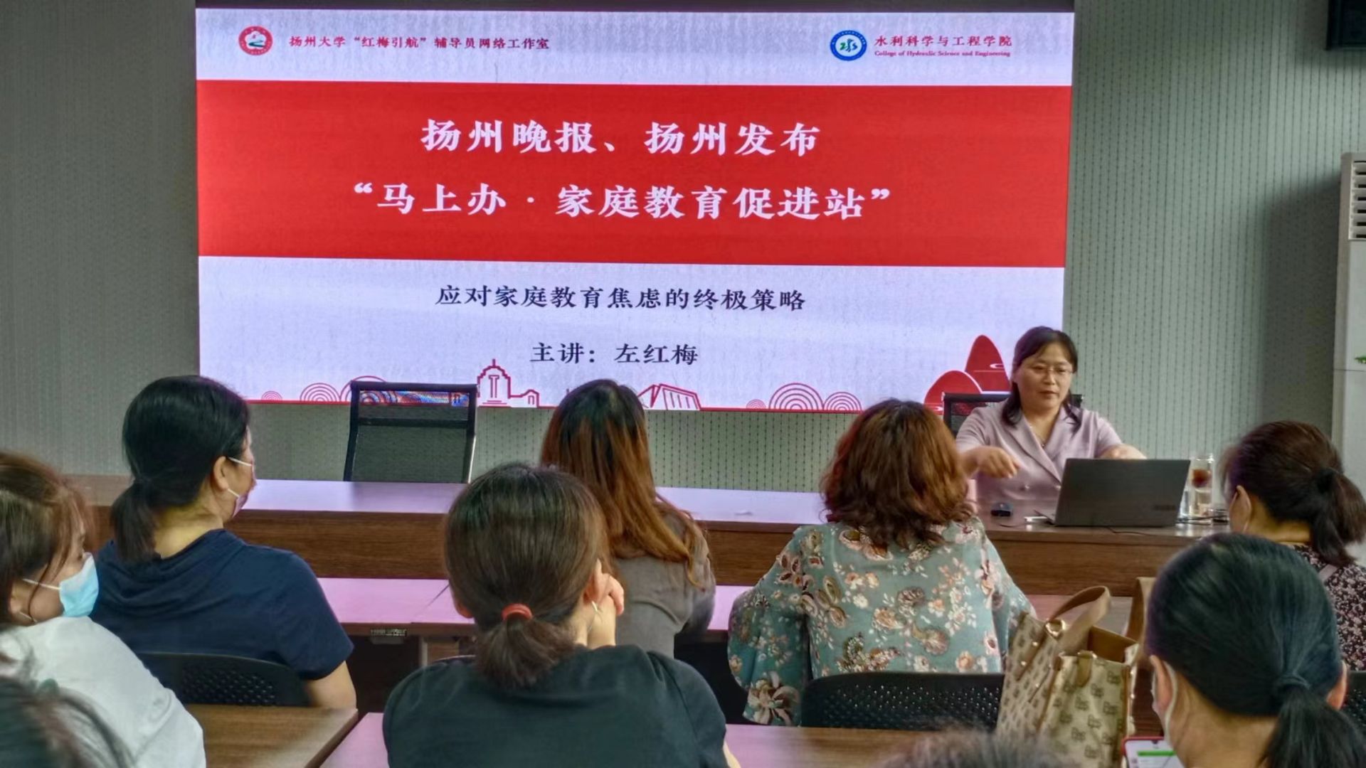 主讲老师左红梅是扬大“红梅引航”辅导员、网络工作室负责人,她不但在家庭教育领域积极实践探索,本身也是两个孩子的母亲。左红梅结合自己对家庭教育的研究和实践,从家庭教育焦虑的由来、如何及时化解焦虑情绪、帮助孩子构建自我学习体系、有效应对孩子的叛逆等方面,进行了系统阐述。
